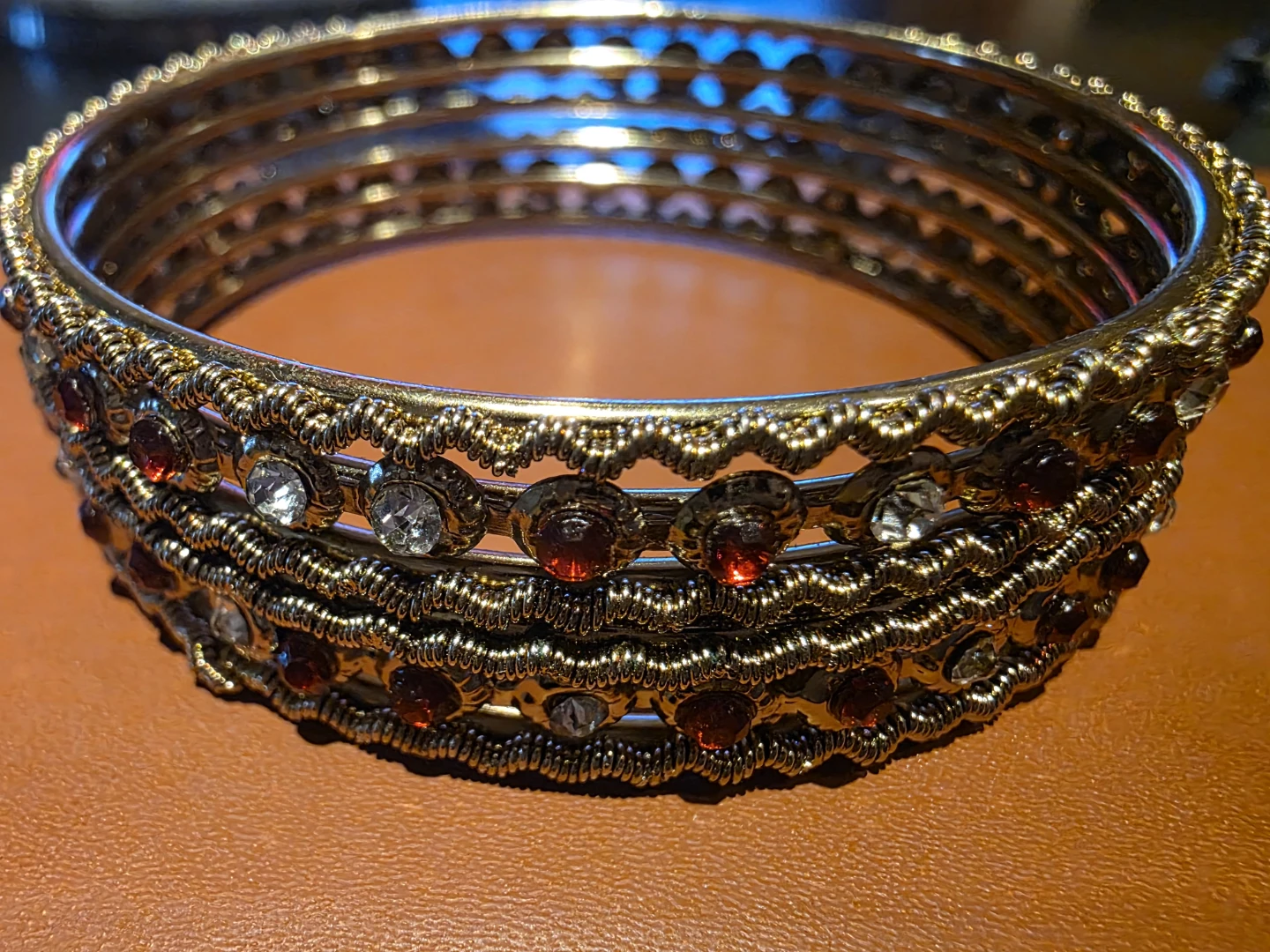 These bangles are gold-toned with decorative red and clear accent stones. They feature intricate woven metal details along the edges and between the stone settings. They come as a set of six, perfect for adding a festive touch to any outfit!