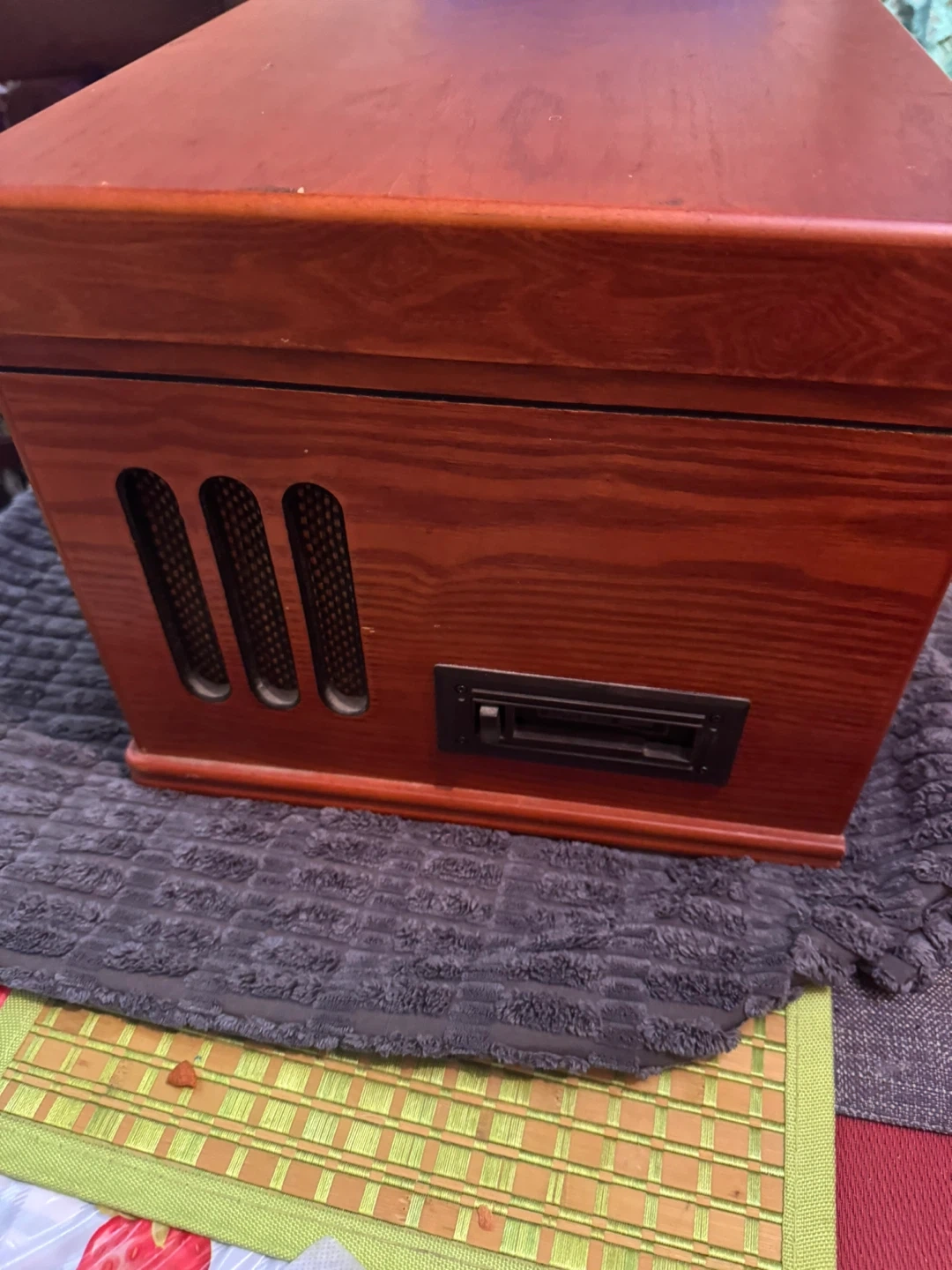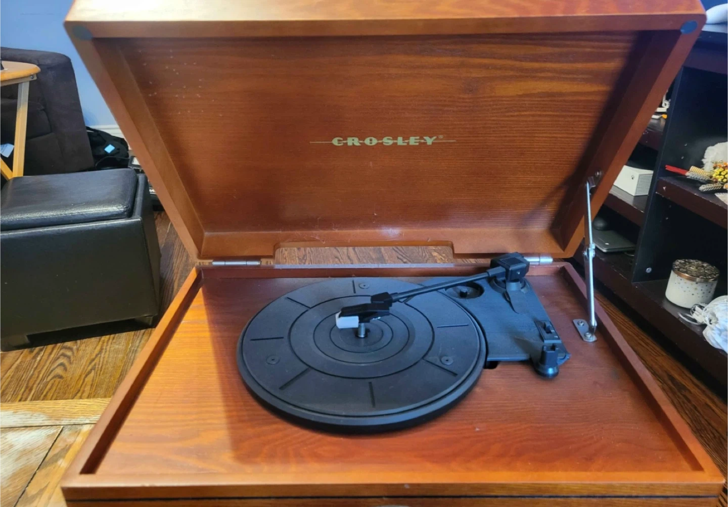 Vintage-style record player by Crosley. It plays vinyl records and includes a built-in radio. The wood casing gives it a classic look. Connect your speakers for amplified sound.