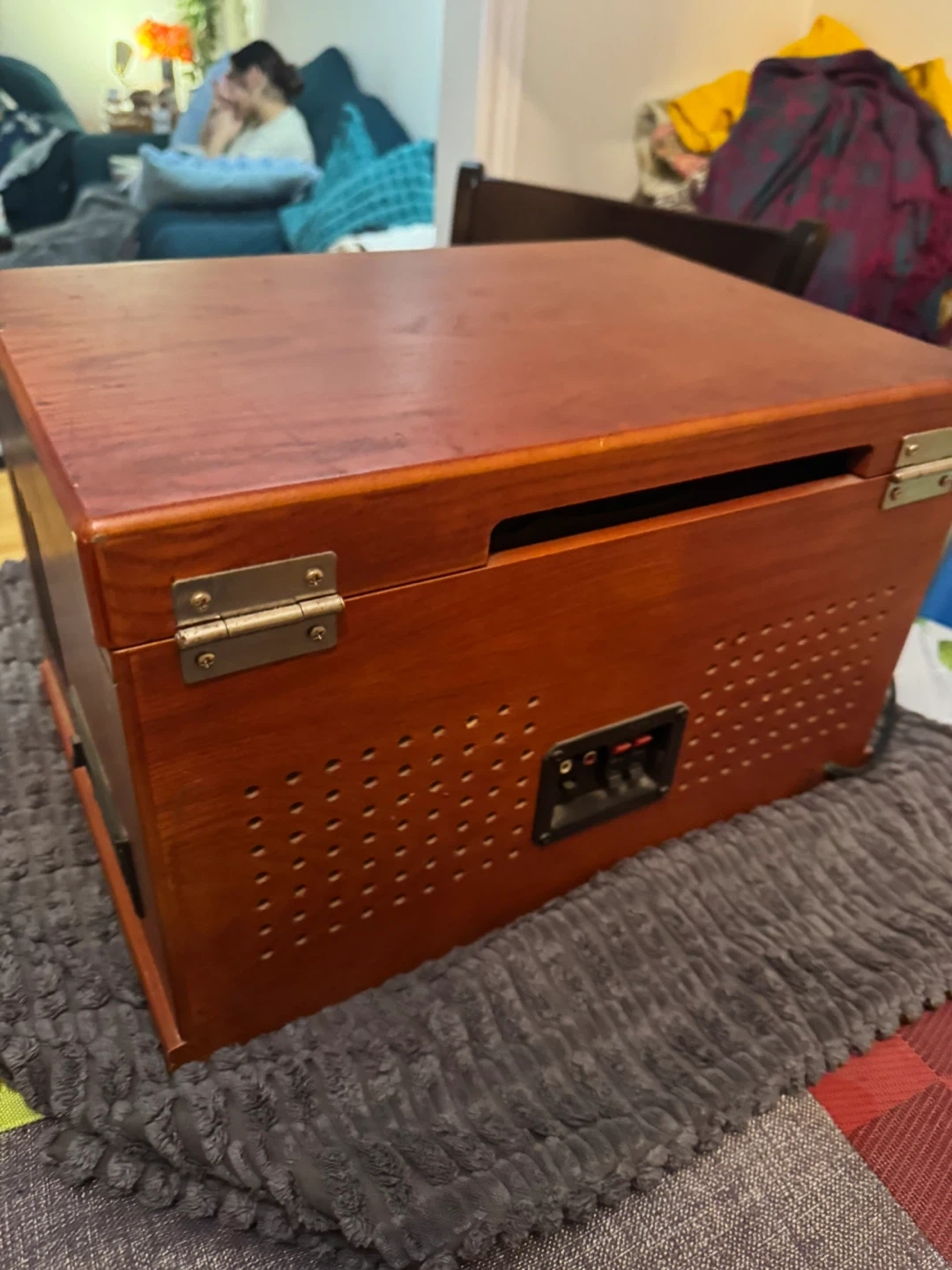 Vintage-style record player by Crosley. It plays vinyl records and includes a built-in radio. The wood casing gives it a classic look. Connect your speakers for amplified sound.