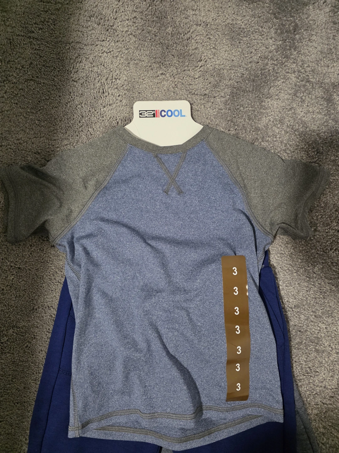 This set includes a blue t-shirt with grey raglan sleeves and two pairs of athletic shorts, one blue and one grey. The t-shirt has a "32°COOL" tag, indicating it's designed for temperature regulation. This outfit is perfect for active play on warm days!