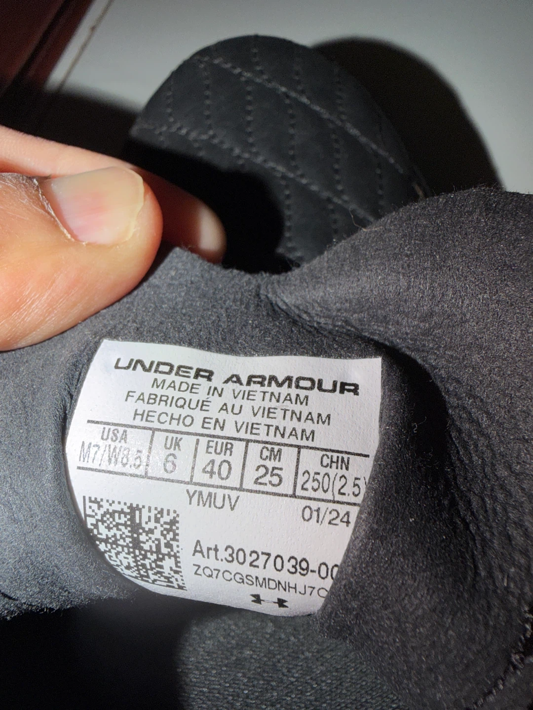 Black Under Armour soccer cleats. Made in Vietnam. Size is 6 UK, 40 EUR, 25 CM. Cleats are good for playing soccer.