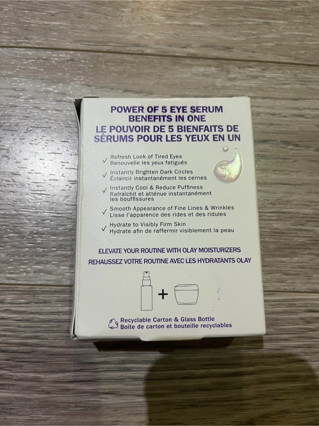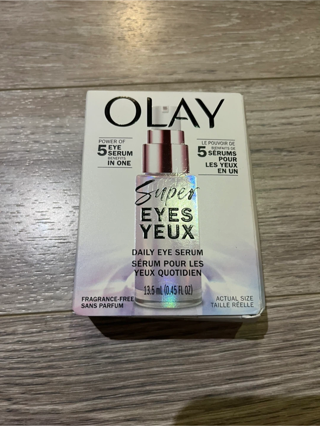 I'm selling an Olay Super Eyes Daily Eye Serum. This serum has 5 powerful ingredients in one. It helps to refresh tired eyes, brighten dark circles, cool and reduce puffiness, smooth fine lines and wrinkles, and hydrate to visibly firm skin! The serum is fragrance-free and comes in a recyclable carton and glass bottle