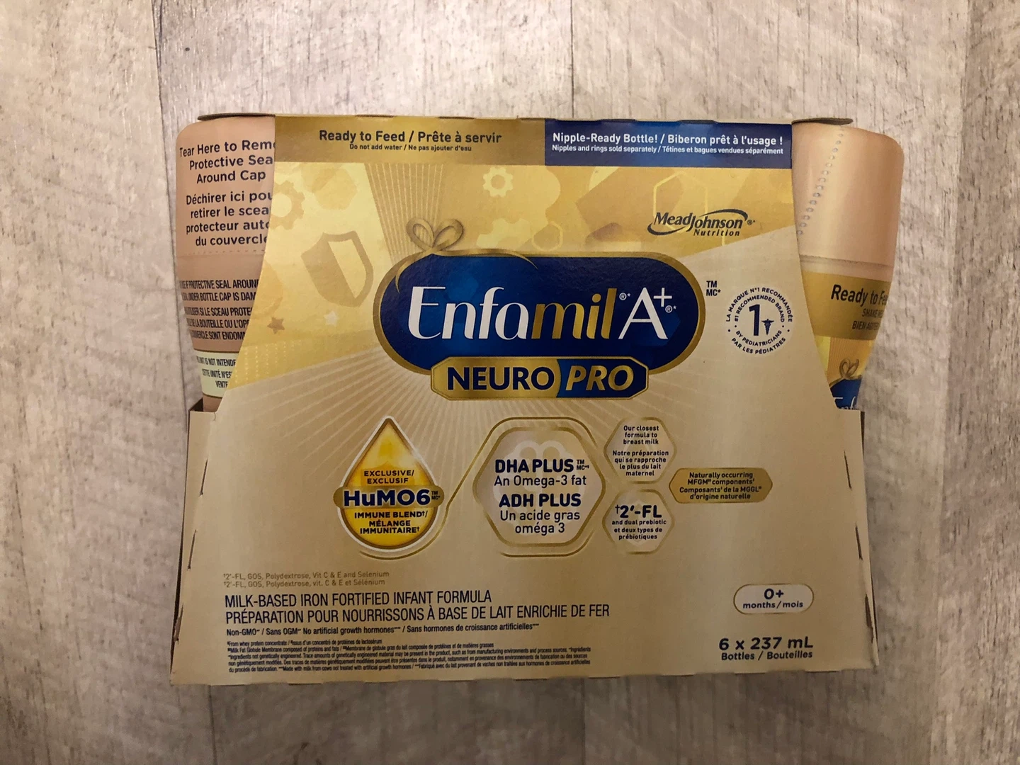 This is Enfamil Neuro Pro infant formula, designed for babies 0+ months. It comes in a 6-pack of 237 ml bottles. The formula includes DHA PLUS and HUMO6 immune blend.