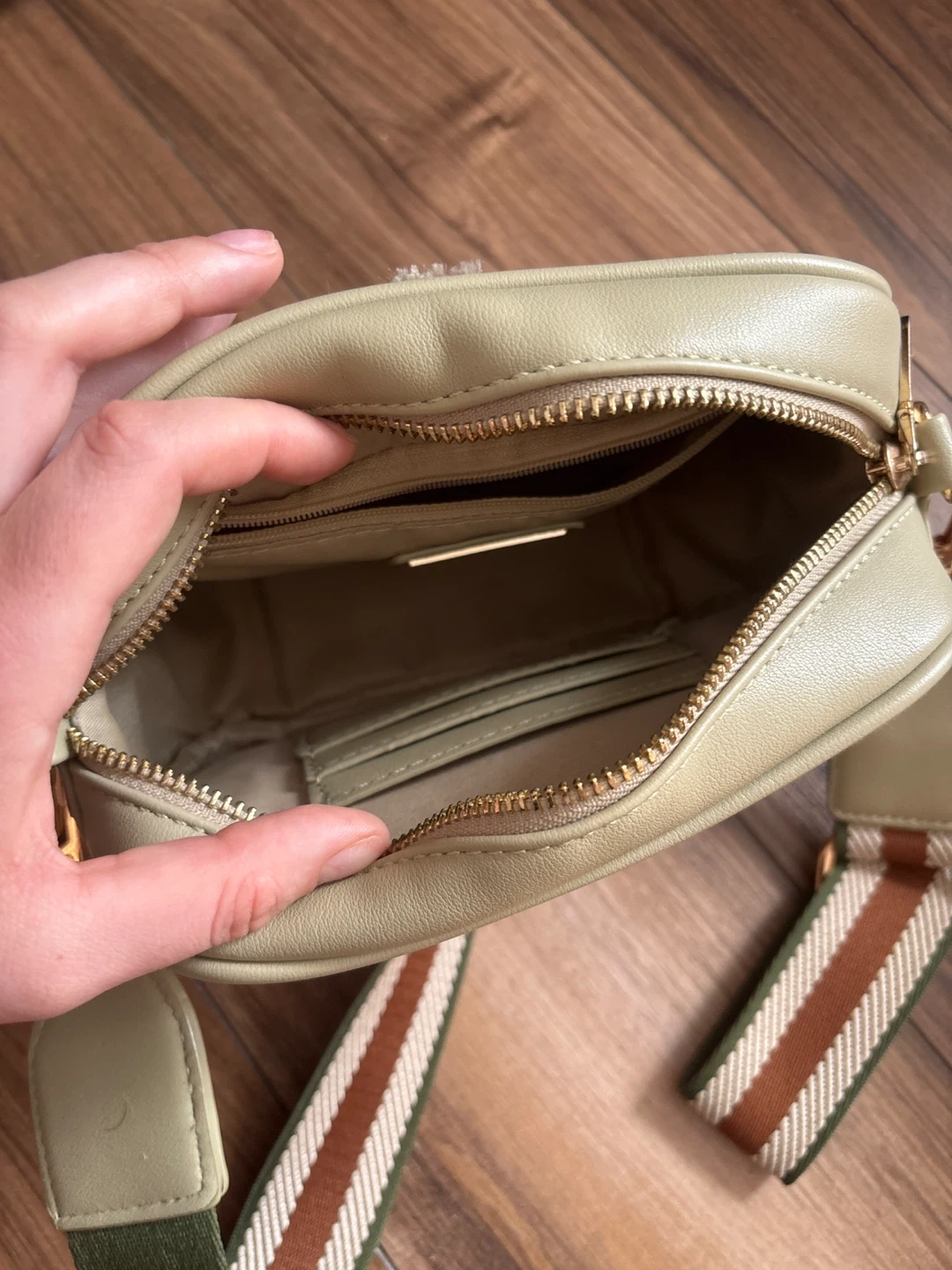 This is a stylish light green crossbody bag. It has a main zippered compartment with interior card slots and pockets. Comes with a striped adjustable strap.