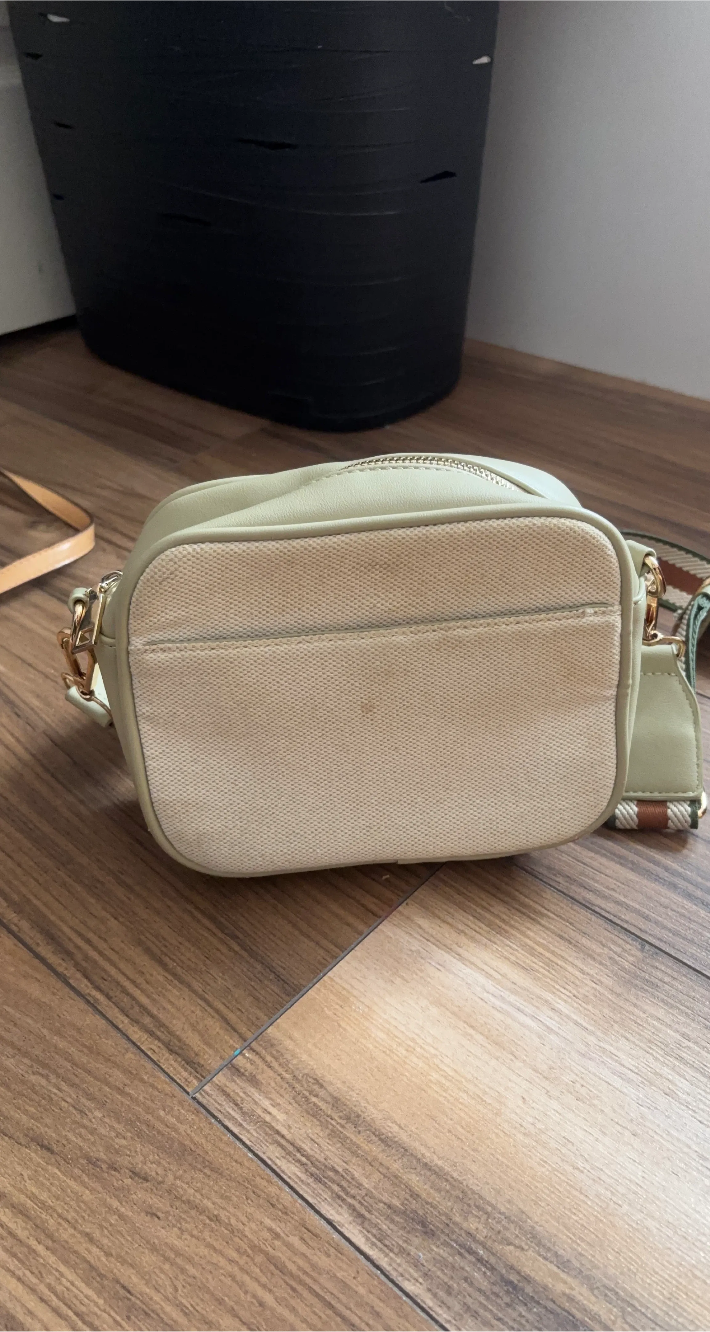 This is a stylish light green crossbody bag. It has a main zippered compartment with interior card slots and pockets. Comes with a striped adjustable strap.