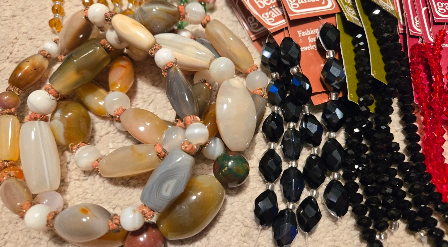 Assorted semi-precious stone and glass beads. Various colors and styles. Great for jewelry making or crafting.
