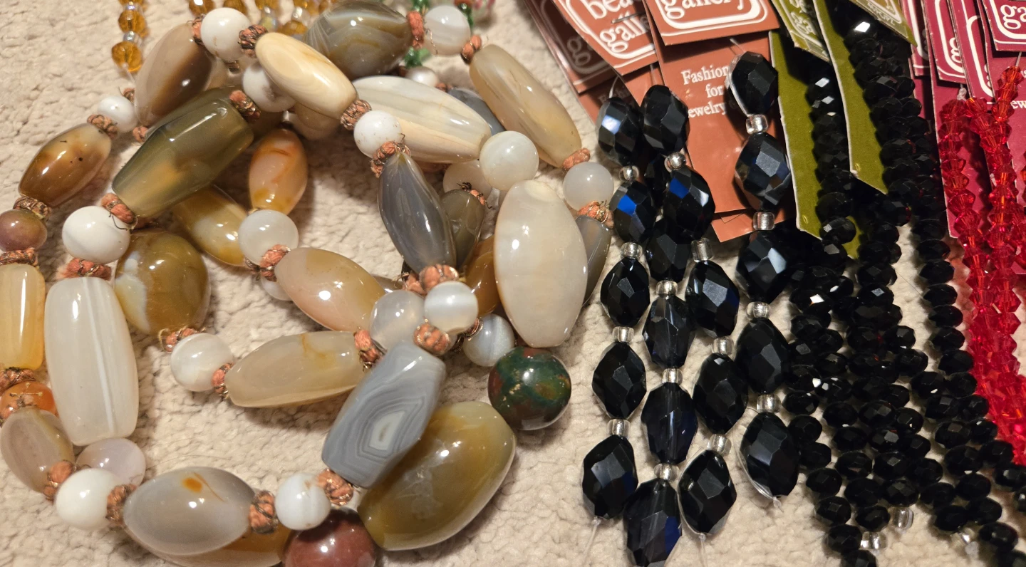 Assorted semi-precious stone and glass beads. Various colors and styles. Great for jewelry making or crafting.