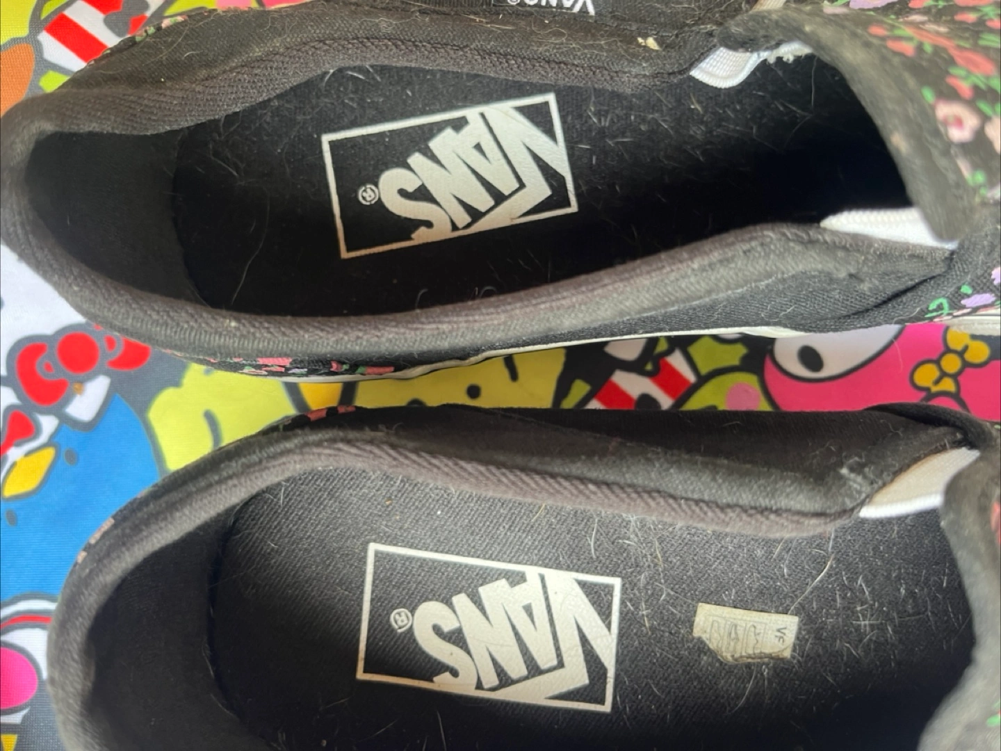 Floral print on black canvas. Slip-on design.