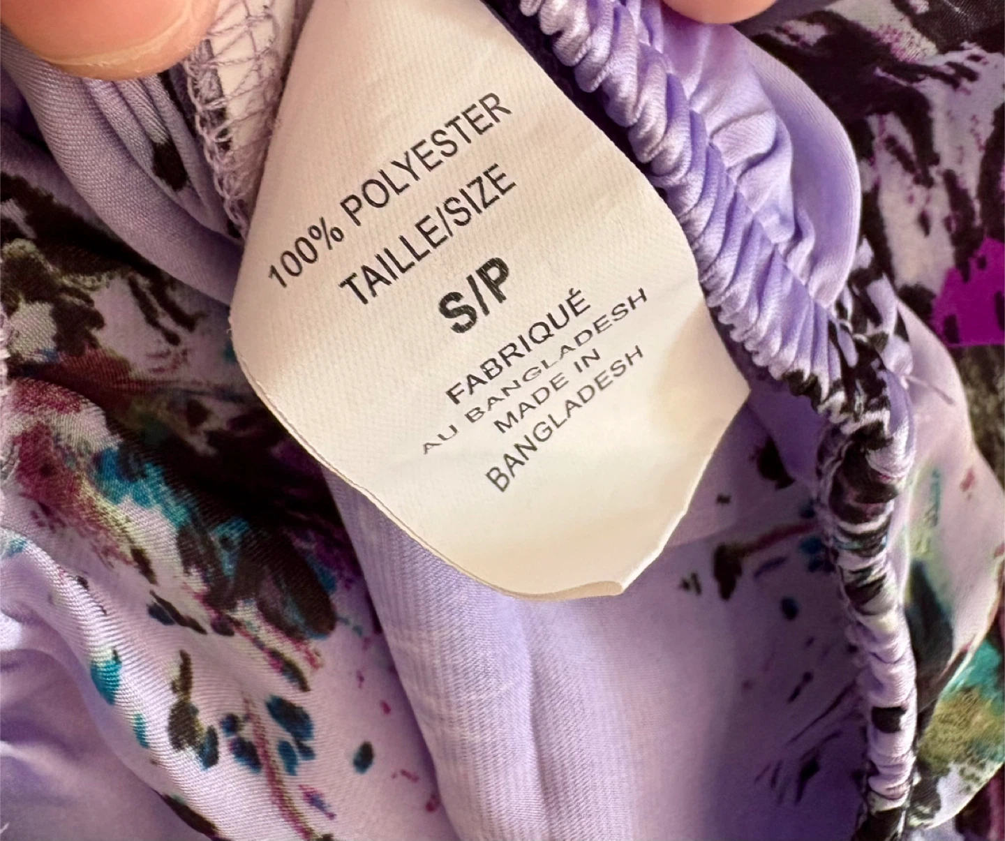 It features a unique floral print on a light purple background.
