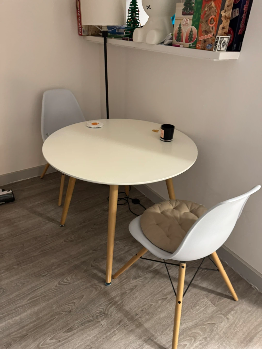 This set includes a white round dining table with wooden legs and two white chairs with wooden legs. One chair has a beige cushion. It's a compact set perfect for small spaces.