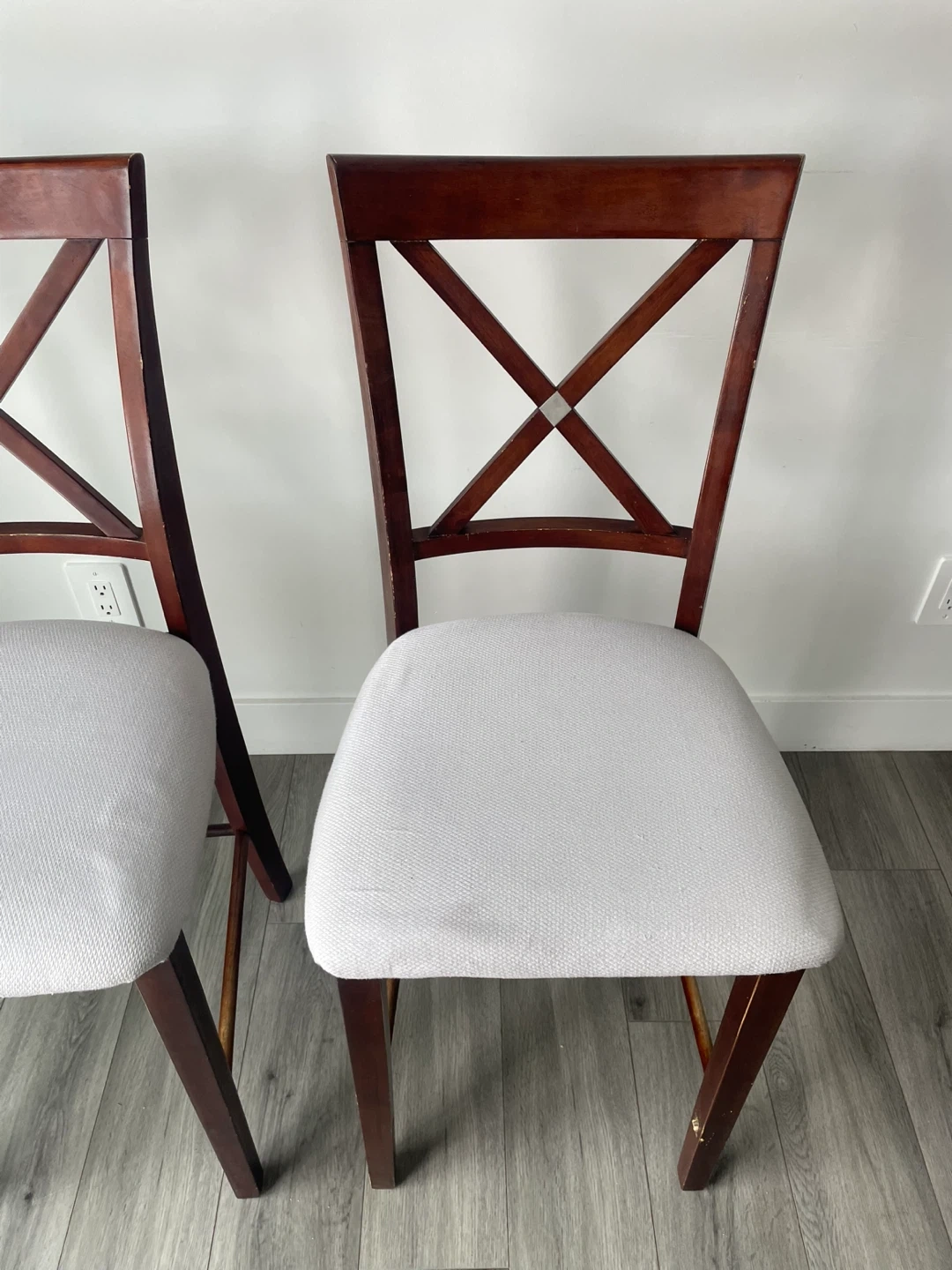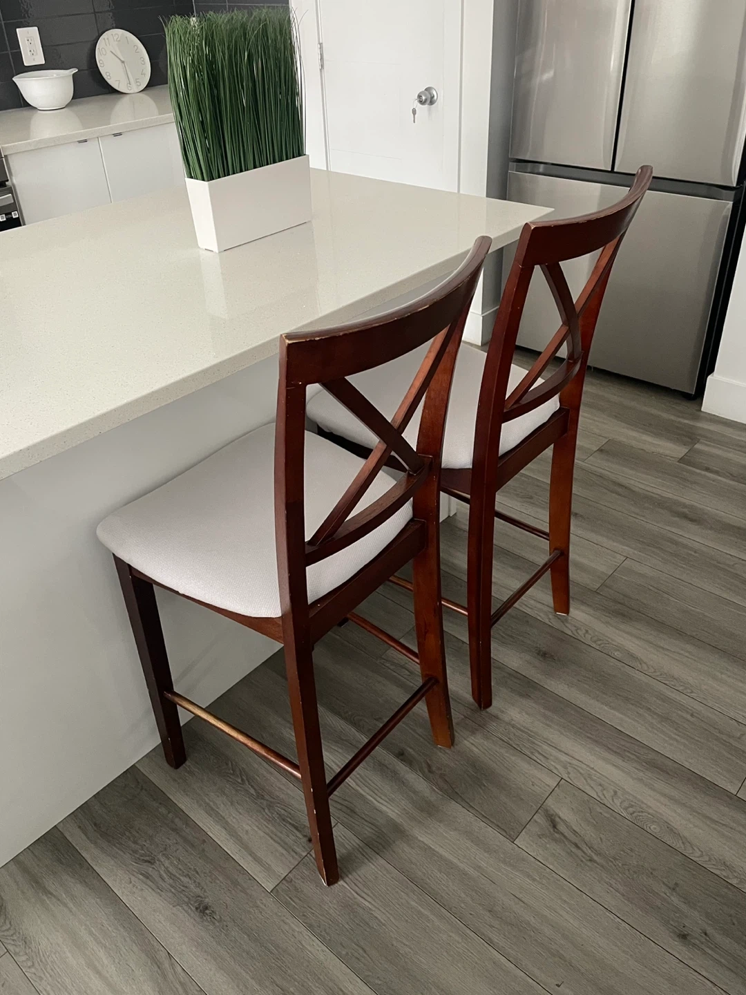 ($40 For Both) Set of 2 Bar/Counter Chairs. In Good Condition Has Some Wear. Wooden Frame & Cushion Seats. The Seats Have Been Re-Upholstered.