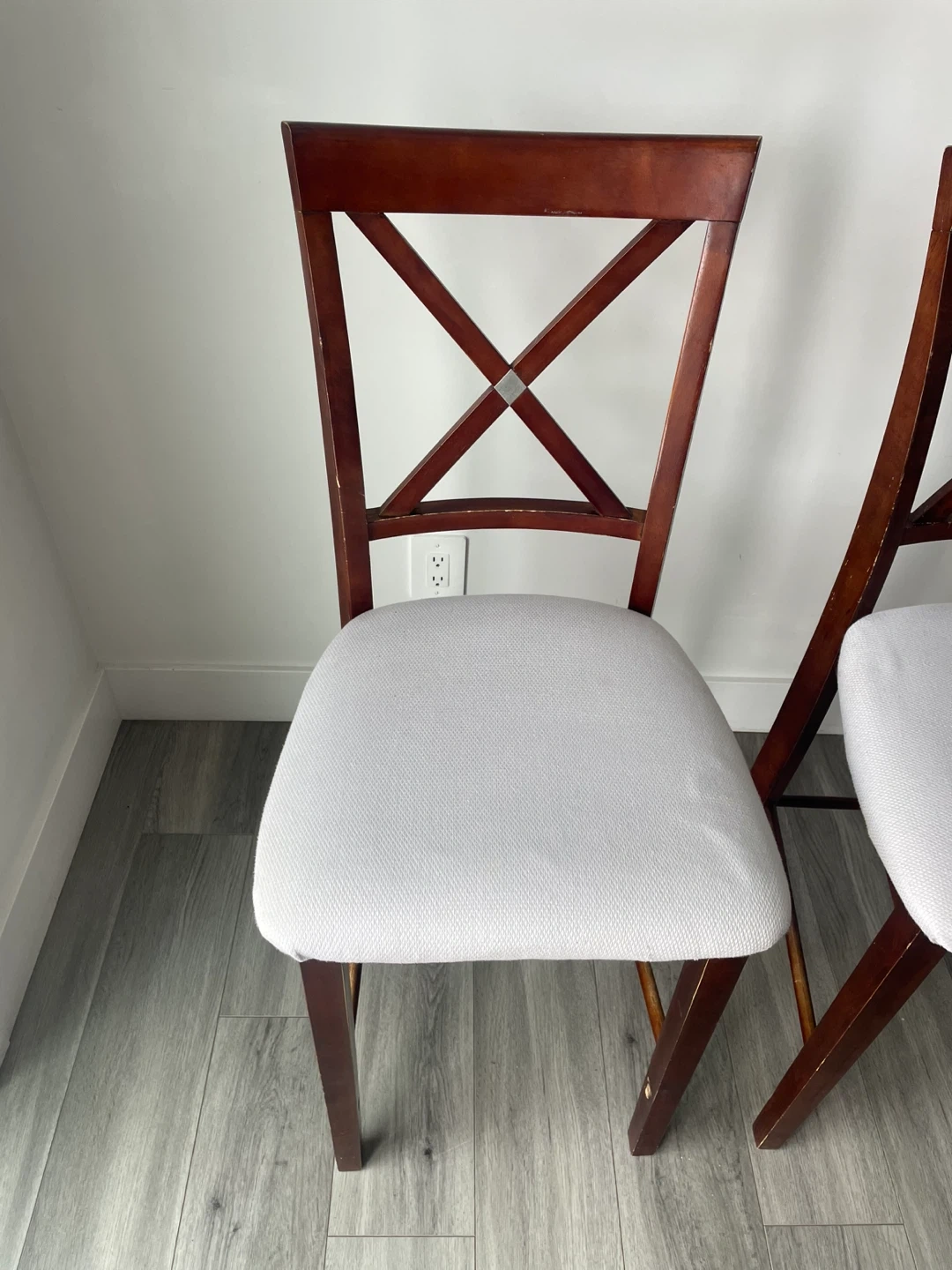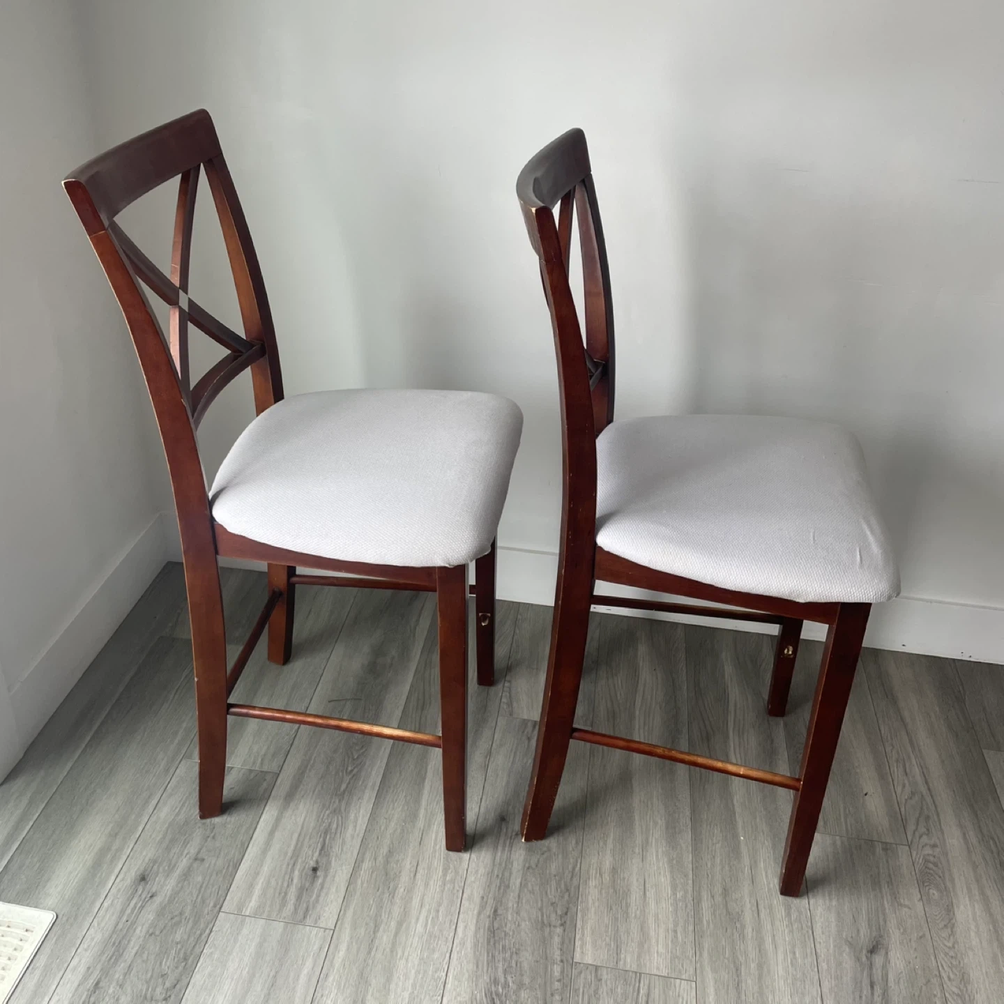 ($40 For Both) Set of 2 Bar/Counter Chairs. In Good Condition Has Some Wear. Wooden Frame & Cushion Seats. The Seats Have Been Re-Upholstered.
