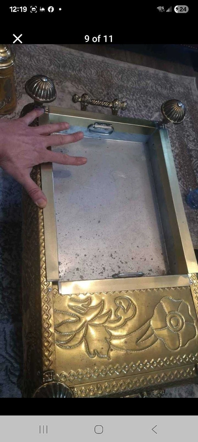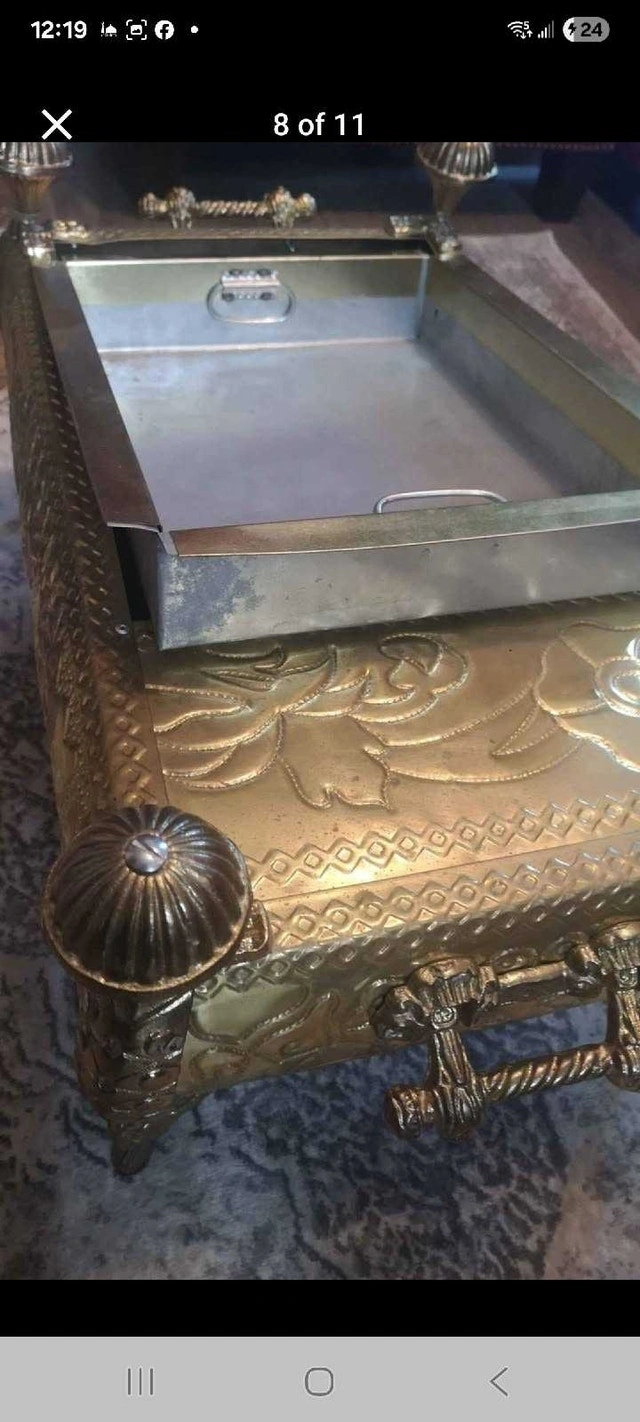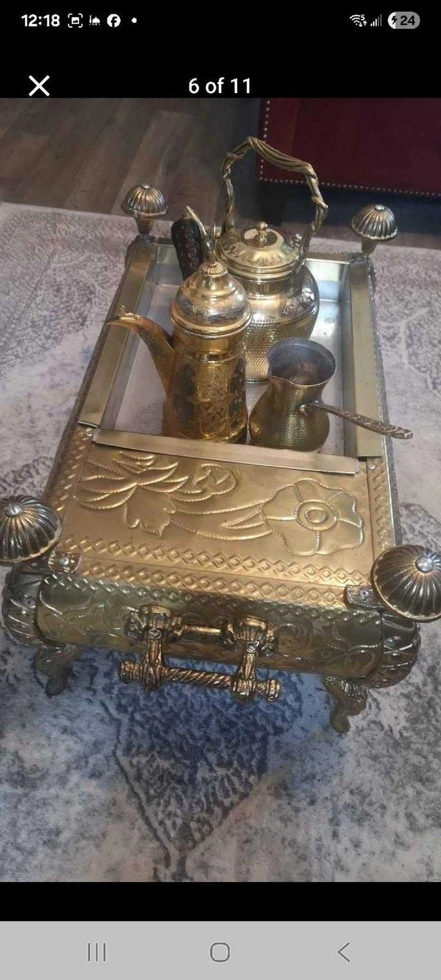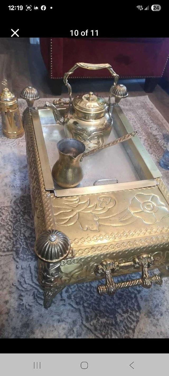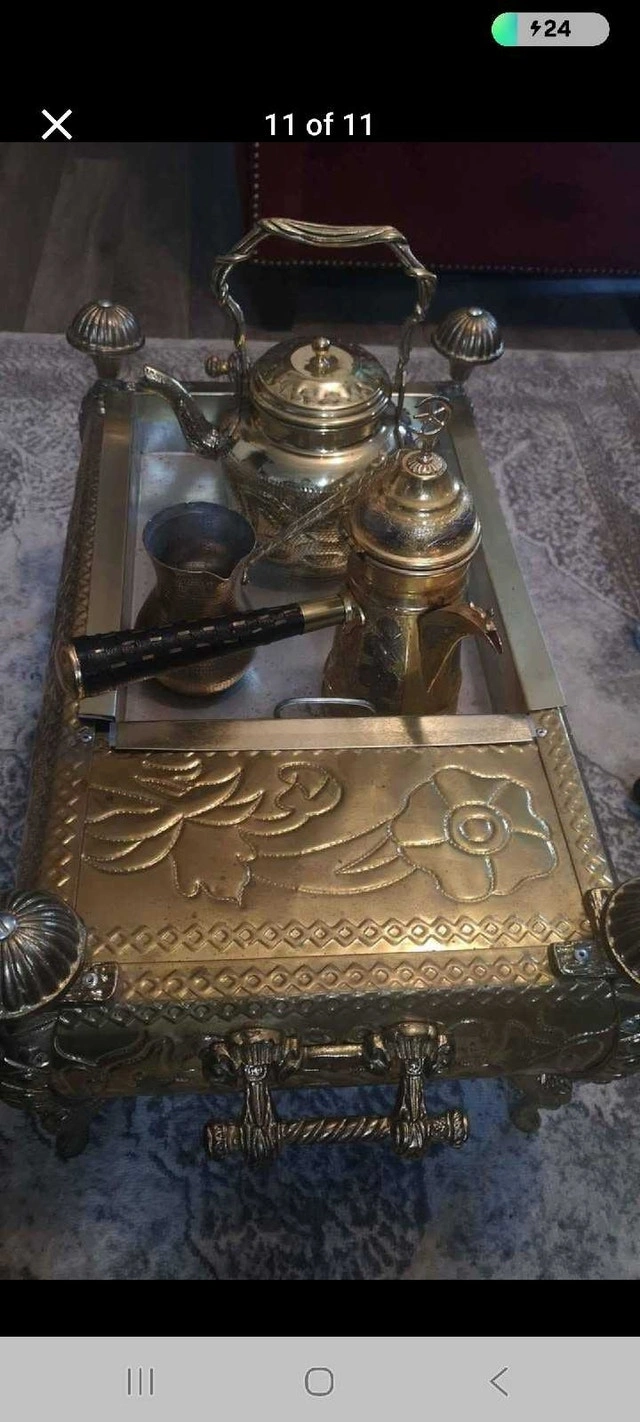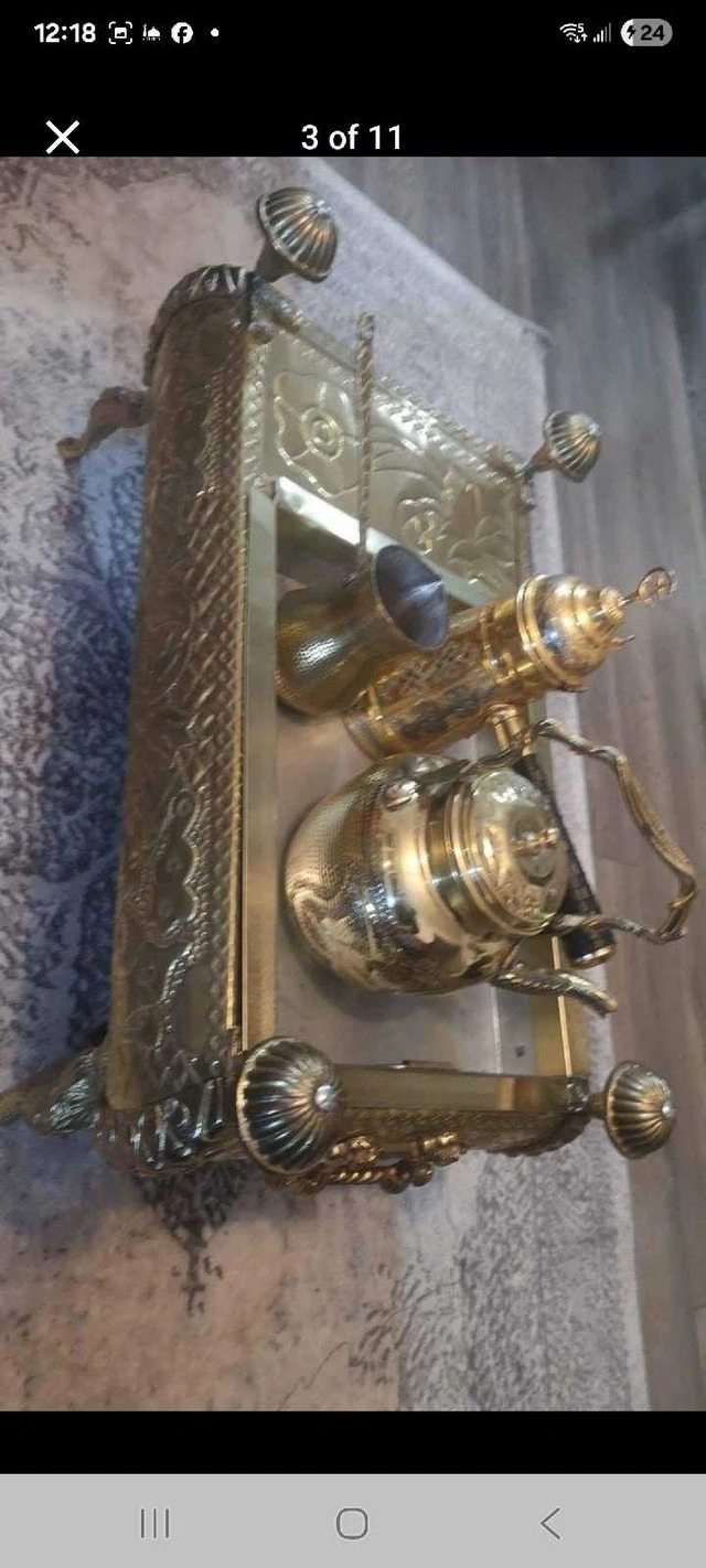 This beautiful, antique-style tea/coffee set with an ornate brass-tone finish is in good condition. It includes a decorative stand, two teapots, a creamer, and a sugar bowl. The set shows signs of age that enhance its vintage charm. Cash accepted.