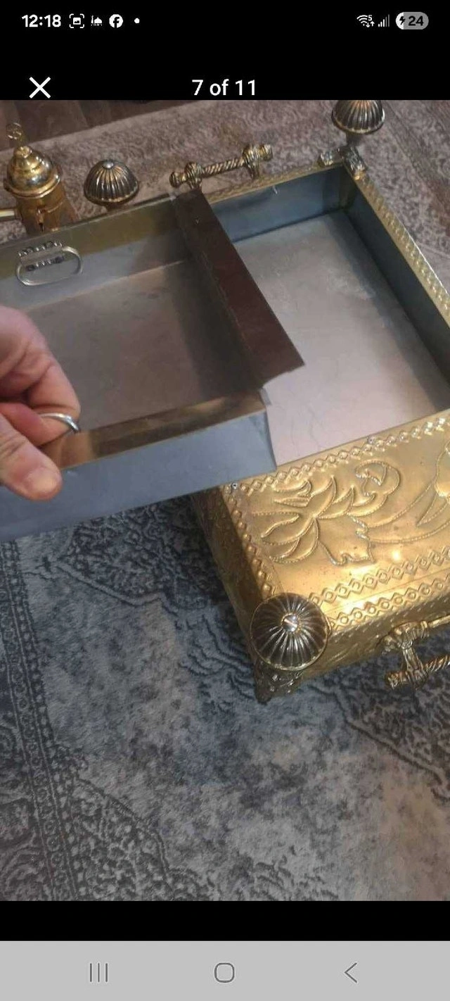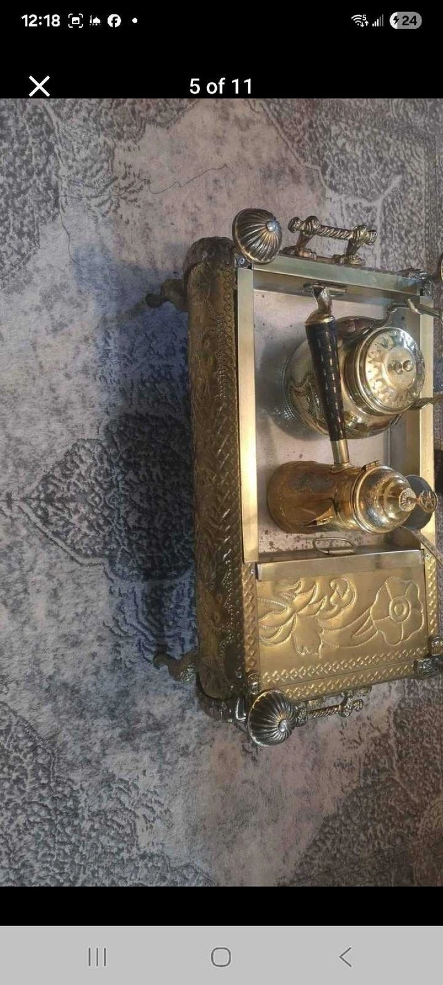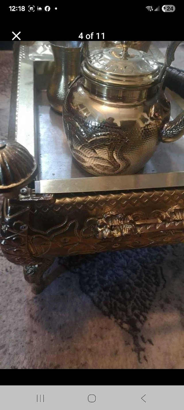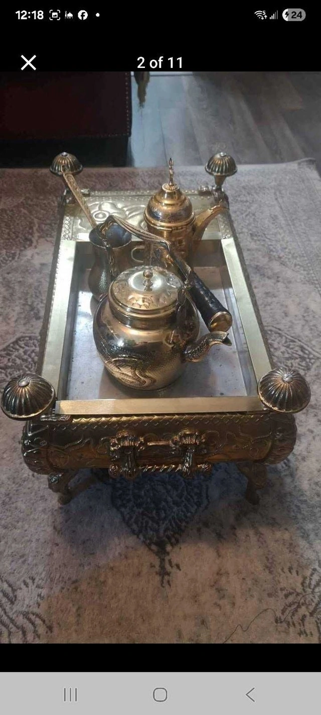 This beautiful, antique-style tea/coffee set with an ornate brass-tone finish is in good condition. It includes a decorative stand, two teapots, a creamer, and a sugar bowl. The set shows signs of age that enhance its vintage charm. Cash accepted.