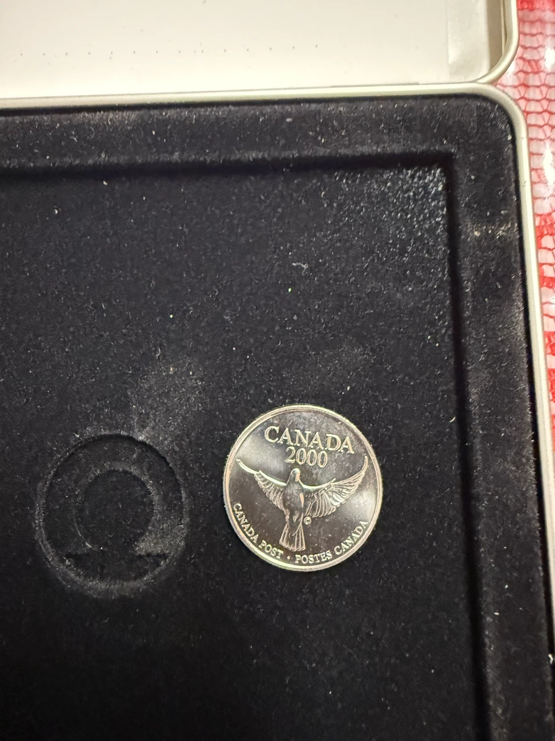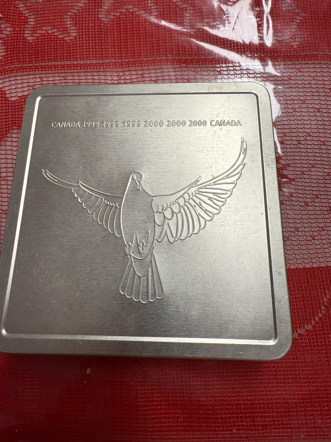 Selling a Canada Millennium 2000 coin in its original box. The coin features a maple leaf design on one side and a dove on the other. A nice piece for collectors!