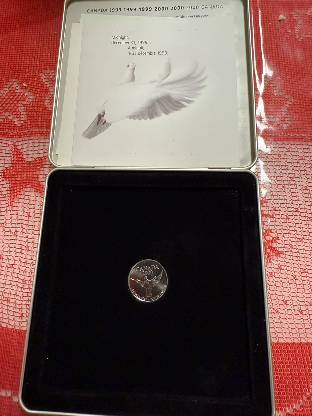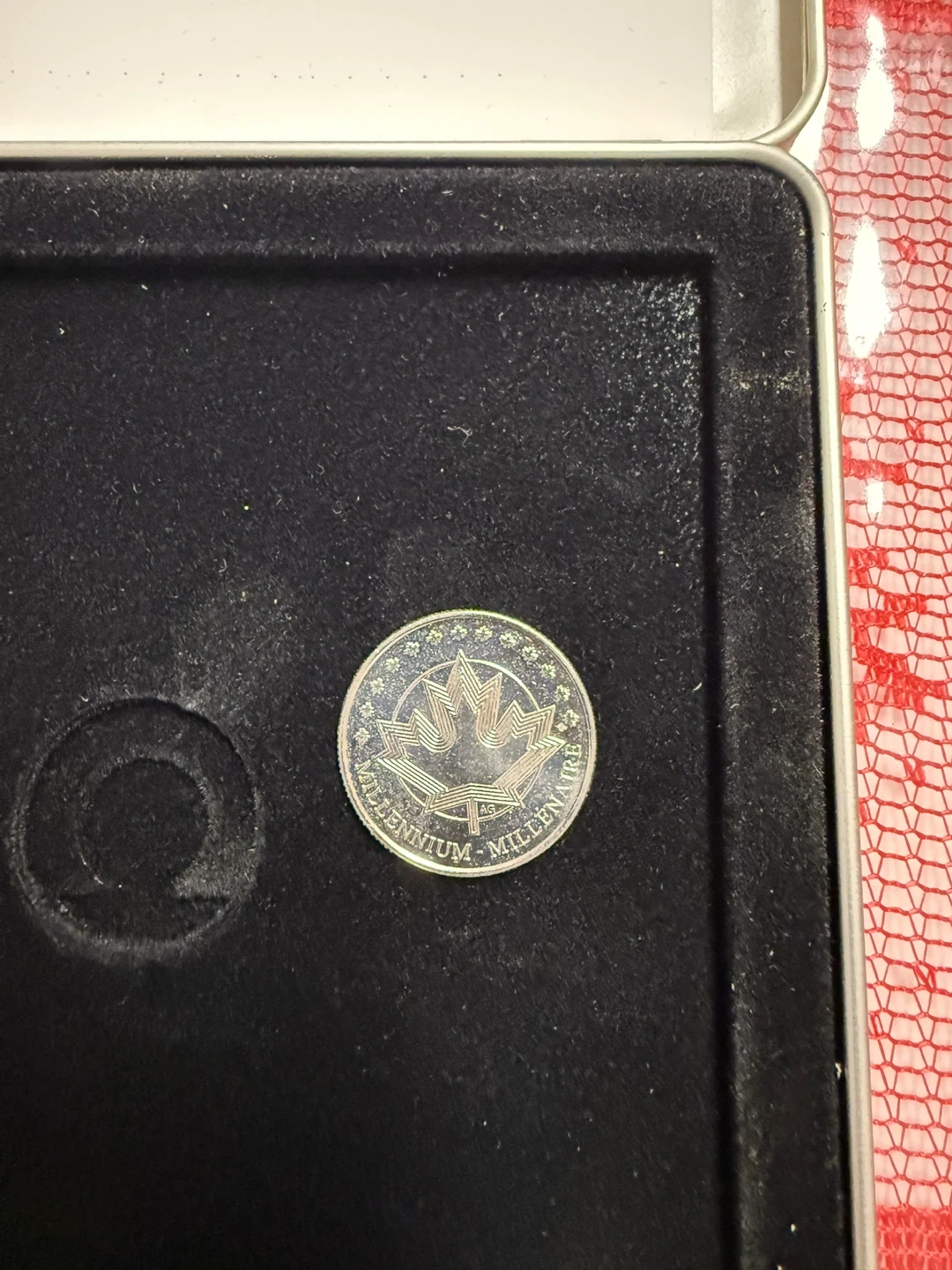 Selling a Canada Millennium 2000 coin in its original box. The coin features a maple leaf design on one side and a dove on the other. A nice piece for collectors!