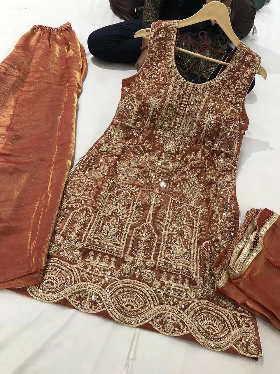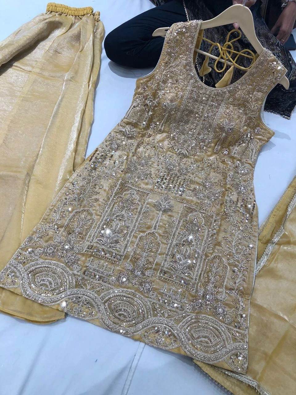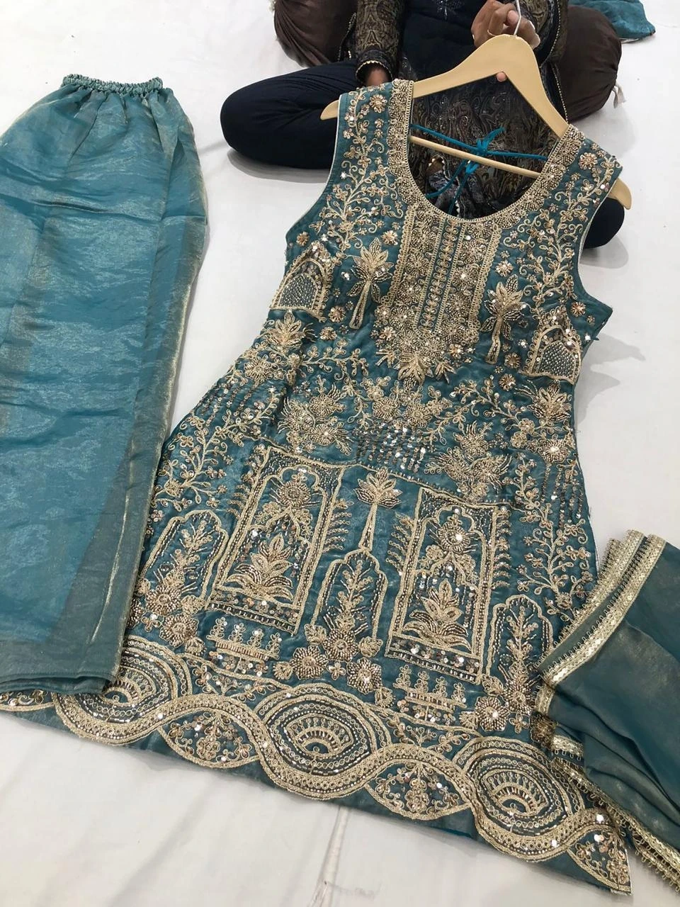 Beautifully embroidered sleeveless kurti paired with matching pants and dupatta. Intricate gold thread work and sequin embellishments adorn the fabric. Perfect for festive occasions or formal gatherings!