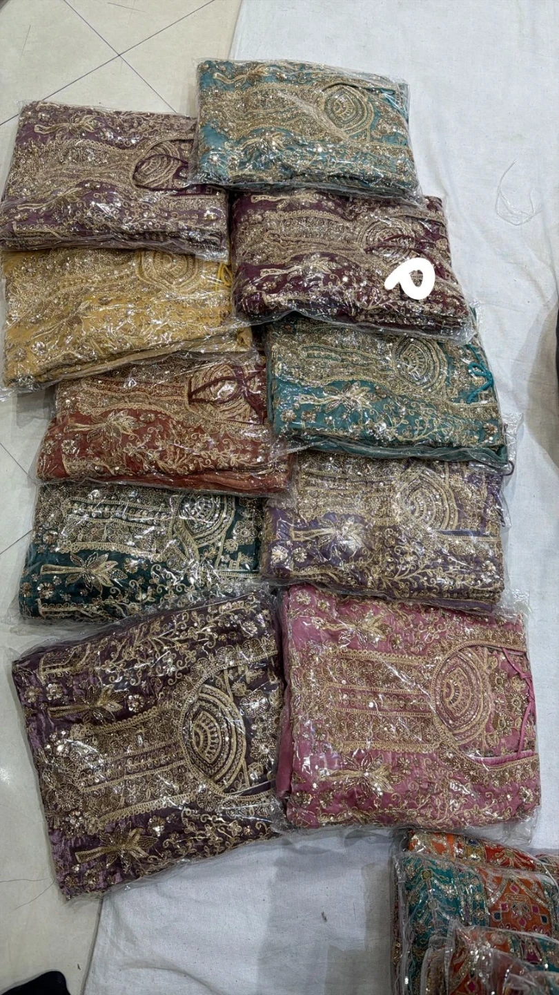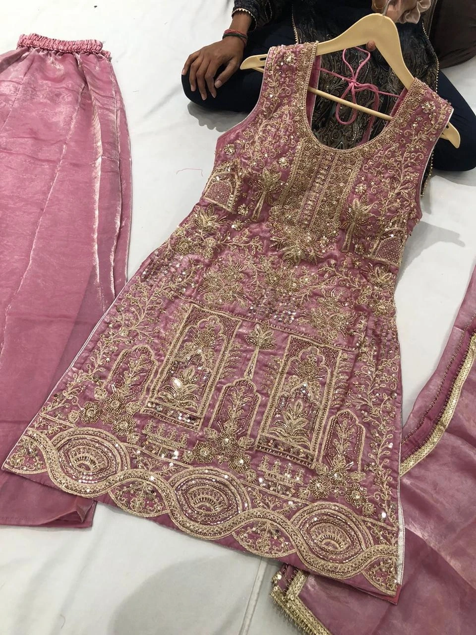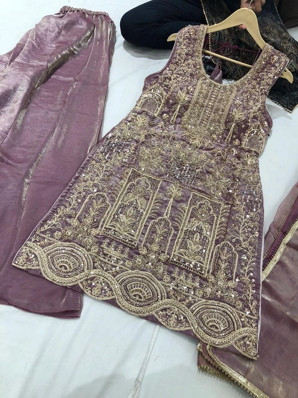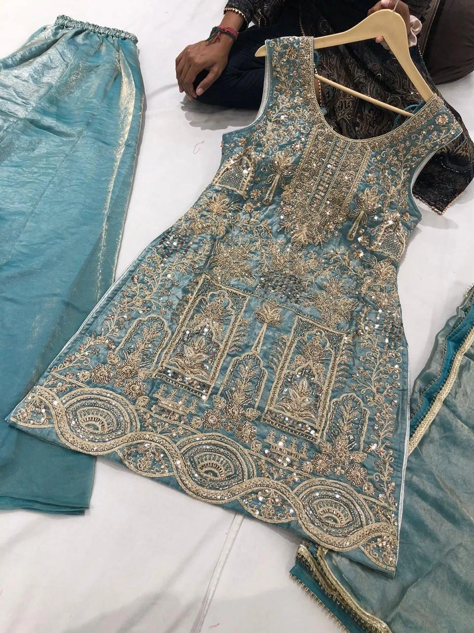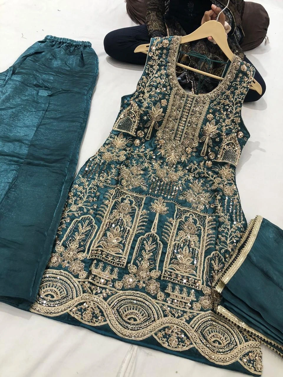 Beautifully embroidered sleeveless kurti paired with matching pants and dupatta. Intricate gold thread work and sequin embellishments adorn the fabric. Perfect for festive occasions or formal gatherings!