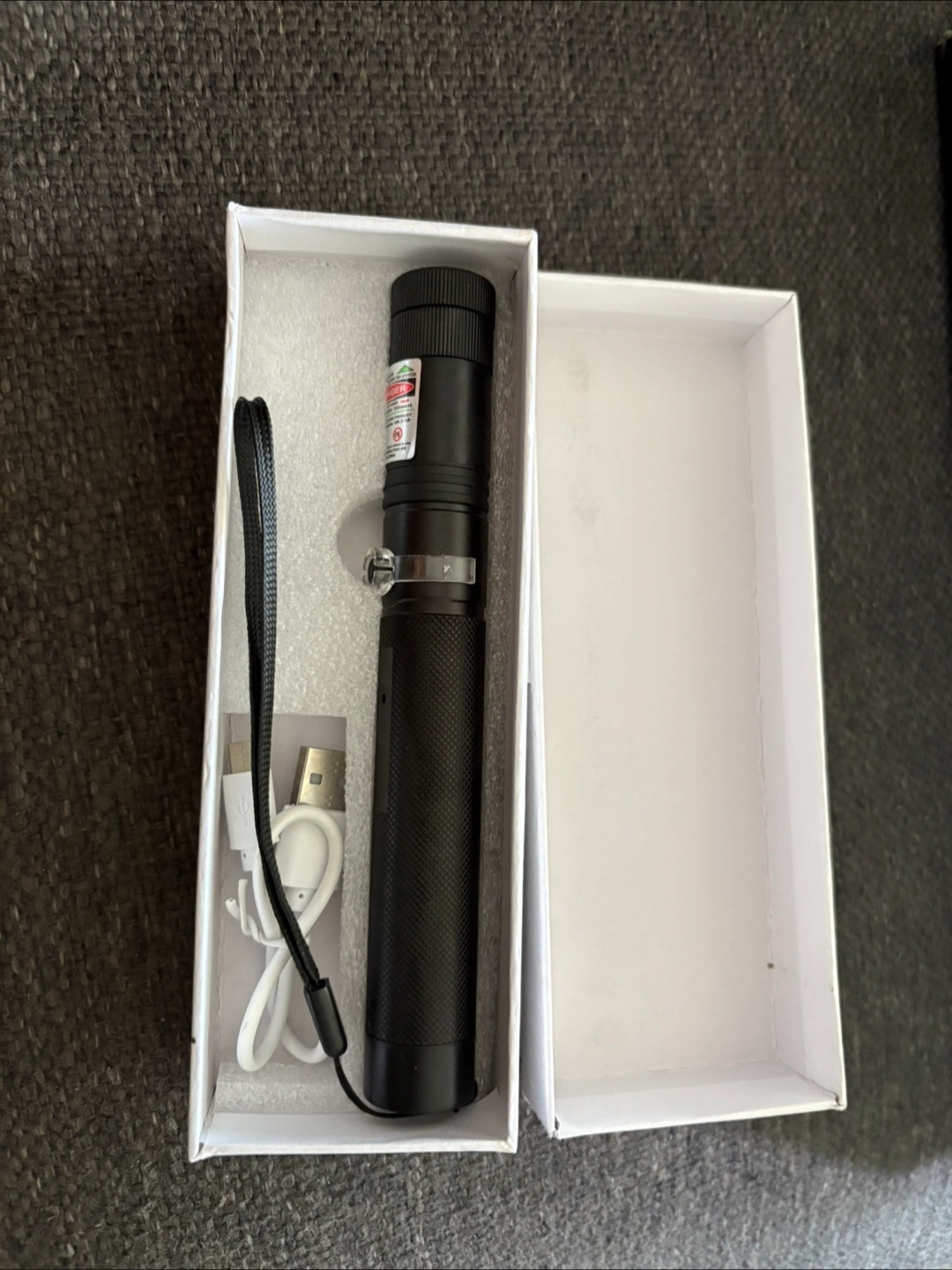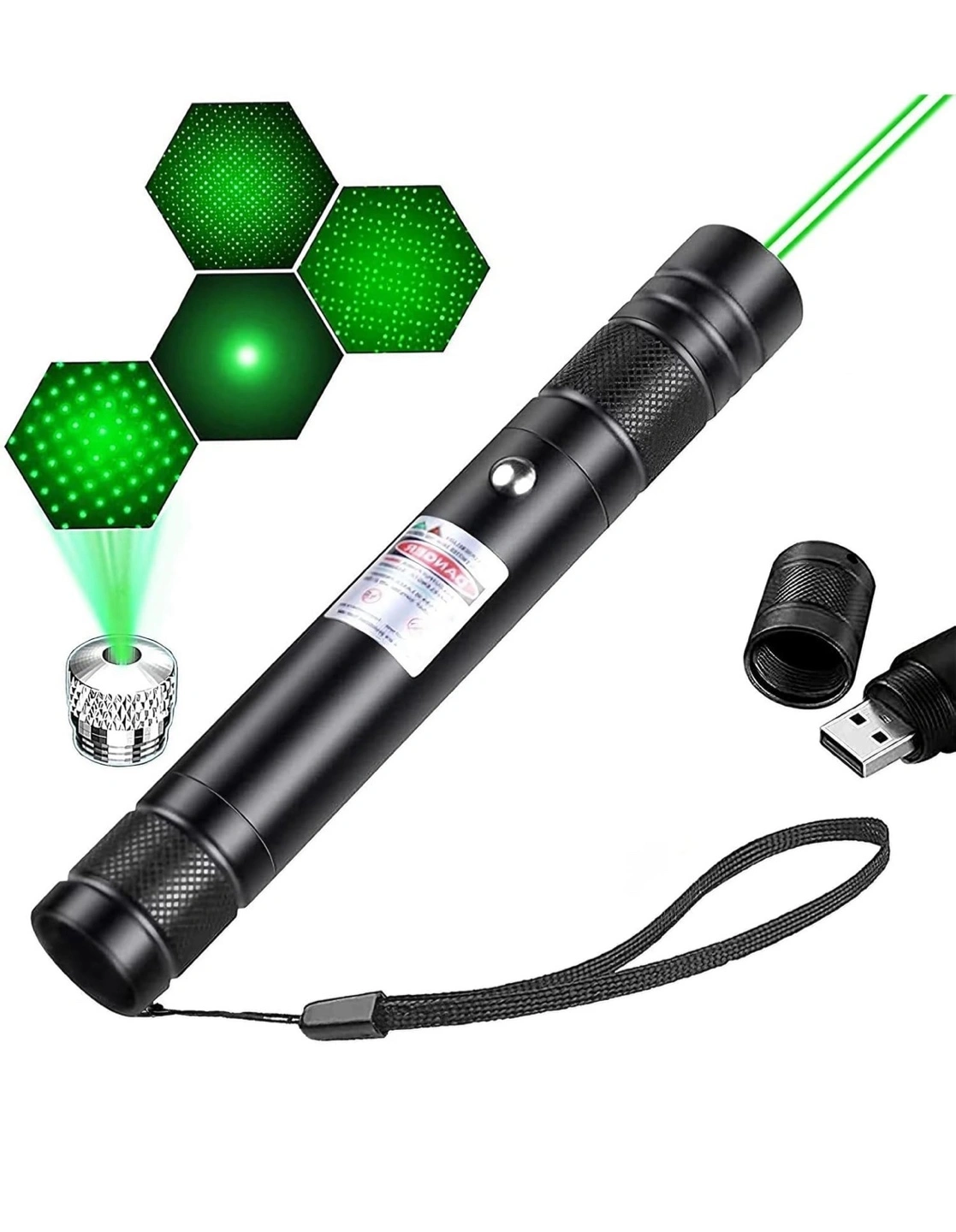 I'm selling a green laser pointer that's in great condition! It comes with a detachable star cap to create a beautiful gypsophila pattern with every spin. Also includes a USB charger and wrist strap, all in the original box