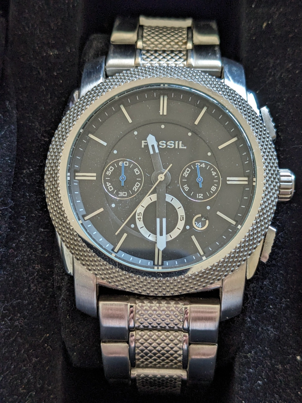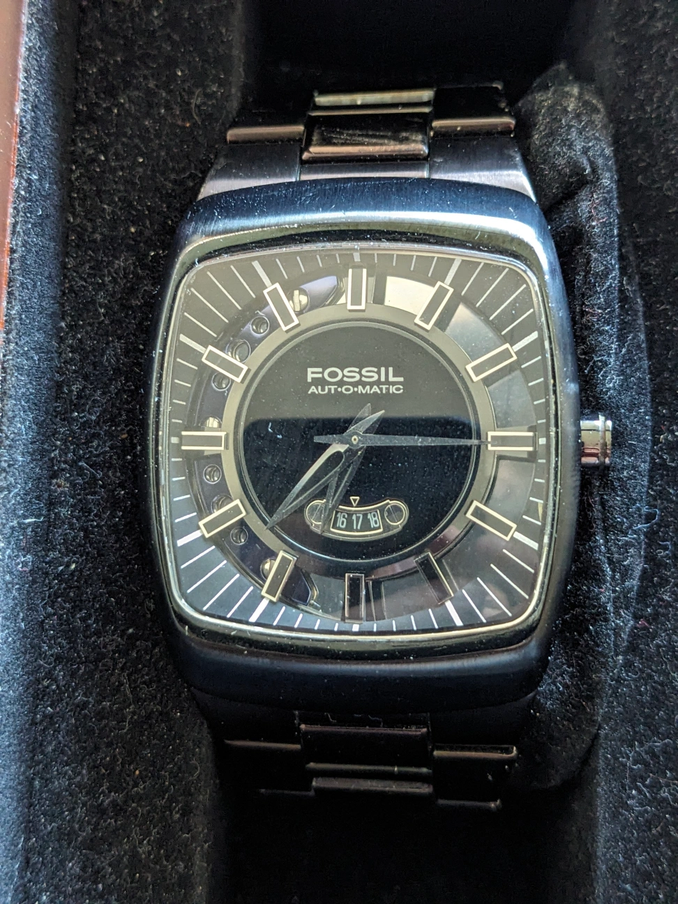 *black metal Fossil square watch is perpetual motion so no battery needed - just wind, set time, and GO!