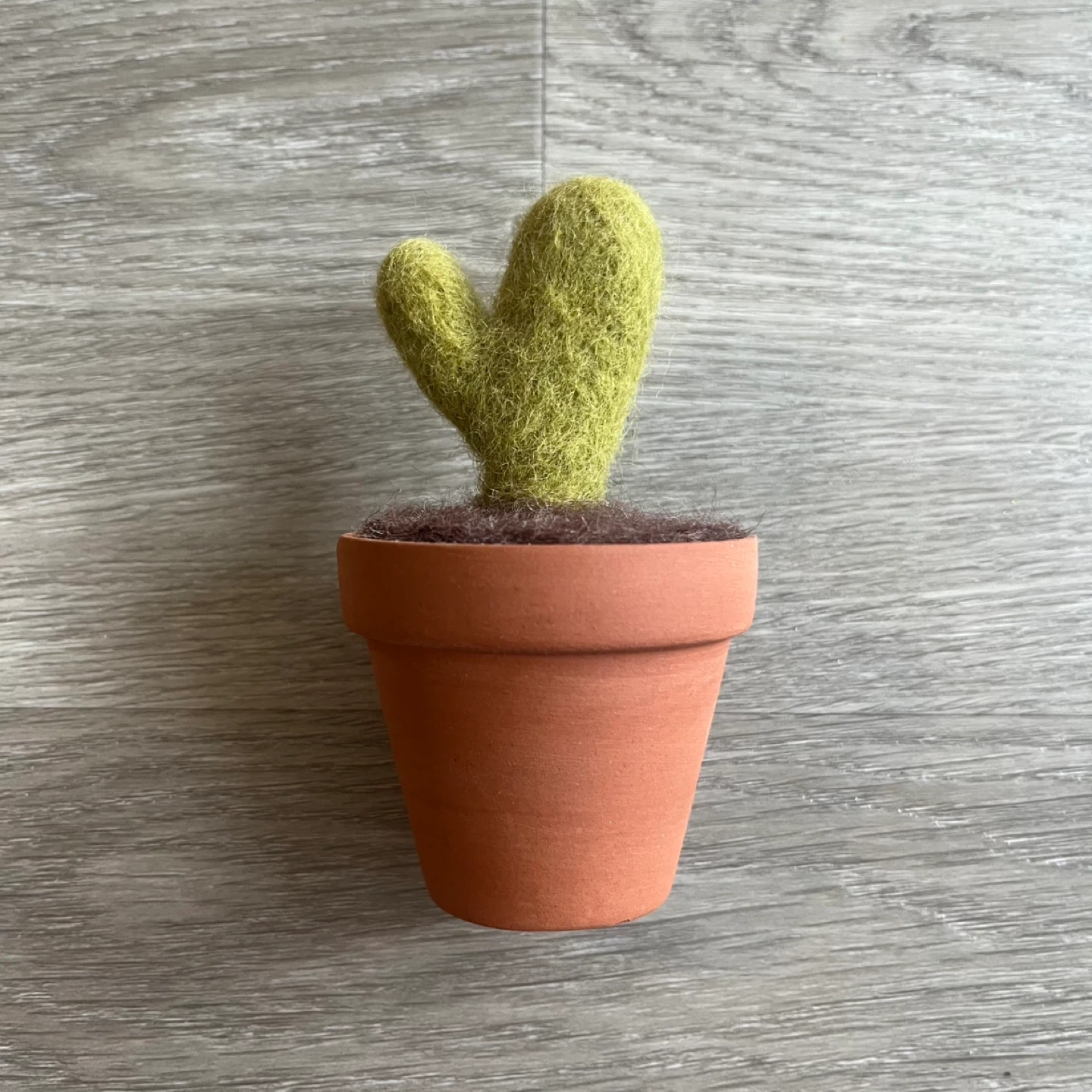 This is a cute, needle-felted cactus in a small terracotta pot. It's handcrafted and a lovely decorative piece. It's perfect for adding a touch of greenery without any maintenance!