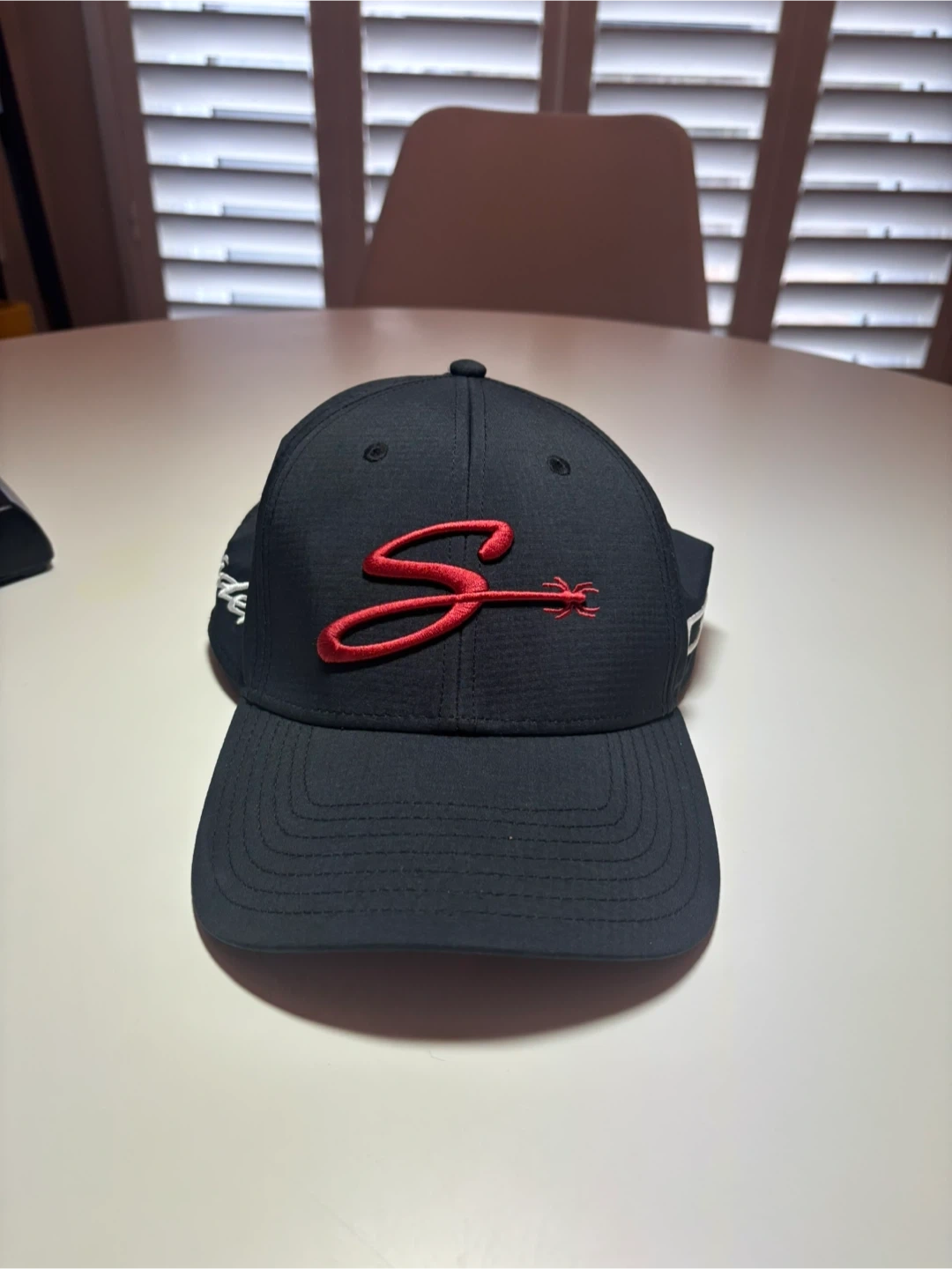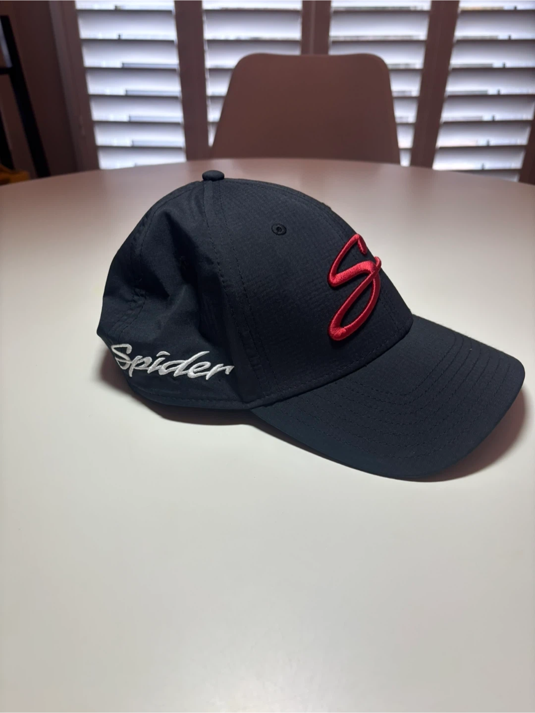 A black TaylorMade golf cap with red Spider logo embroidery. It's adjustable with a velcro strap and has the "Spider" text on the side. Perfect for sunny days on the course!