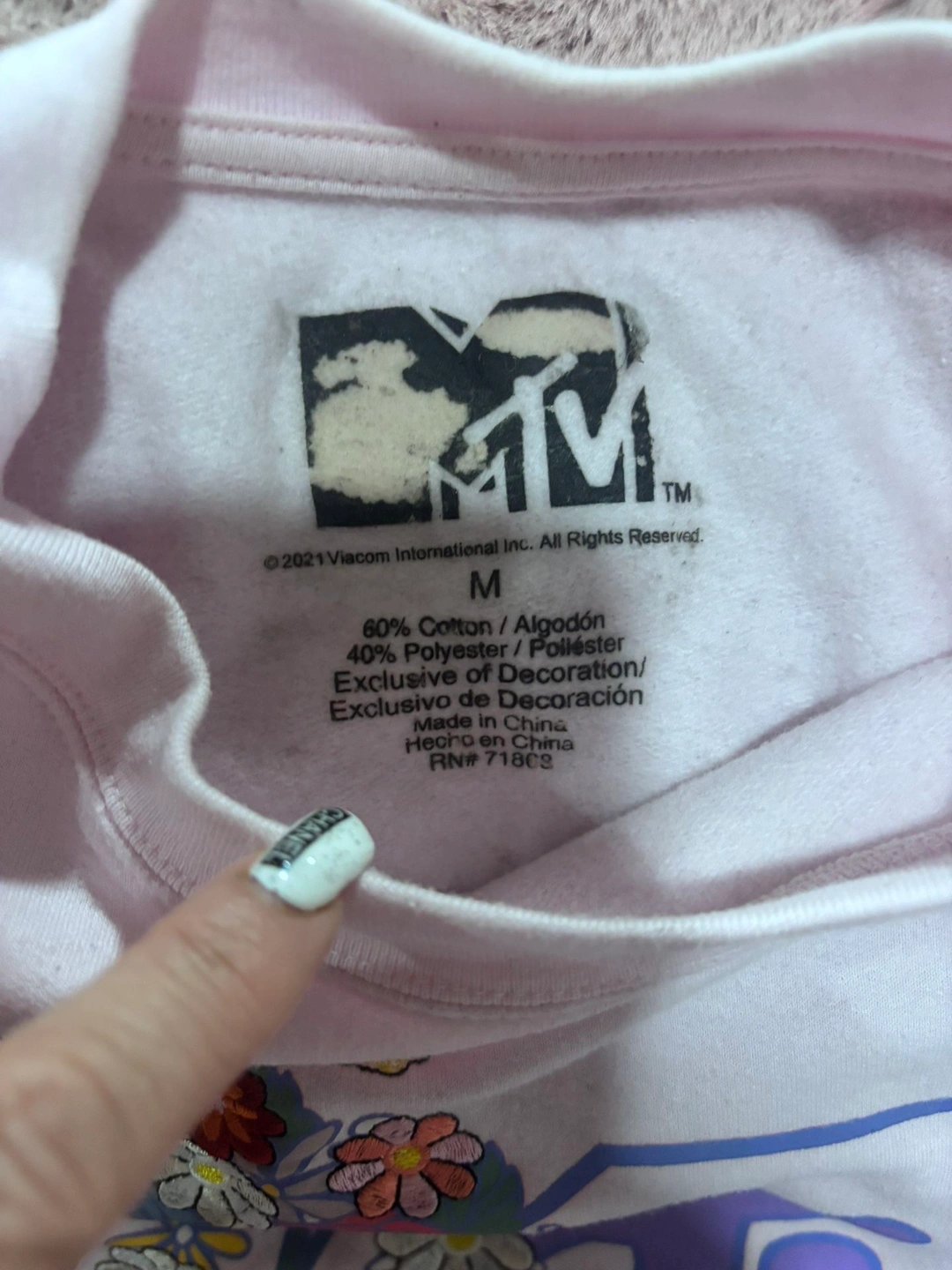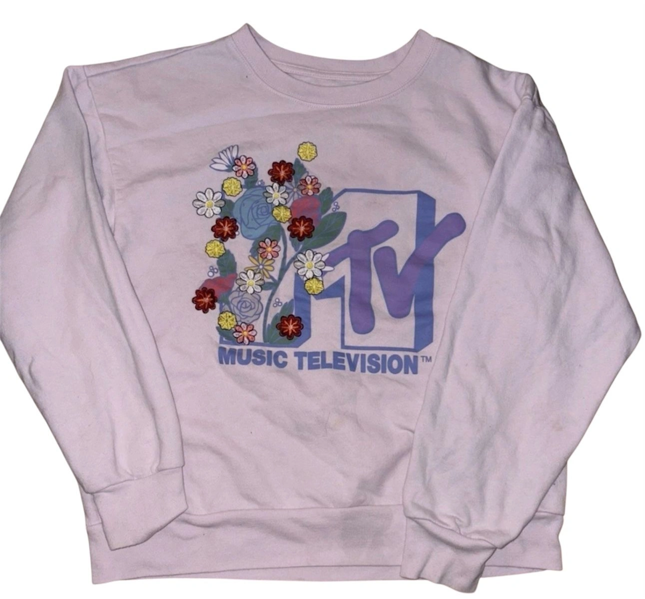 Excellent condition pre-owned MTV Music Television sweatshirt in a soft light pink color. Features a beautiful embroidered floral MTV logo on the front, giving it a fun retro-inspired look with a feminine touch. Cozy, comfortable, and easy to style for casual wear. This sweatshirt is in excellent condition! The embroidery is vibrant and intact, and the fabric remains soft. Brand: MTV (Music Television) Size: Women’s Medium - fits a small too. Color: Light / pale pink. Crewneck sweatshirt with embroidered graphic. Long sleeves with ribbed cuffs and hem. Officially licensed merchandise. Material: 60% Cotton / 40% Polyester. Measurements (laid flat): Length: 21 inches (shoulder to hem). Pit to pit: 18 inches (across chest). Please compare measurements to a similar item you own to ensure best fit. Perfect for casual outfits, lounging, layering, or adding a retro pop to your wardrobe. A great everyday sweatshirt.
