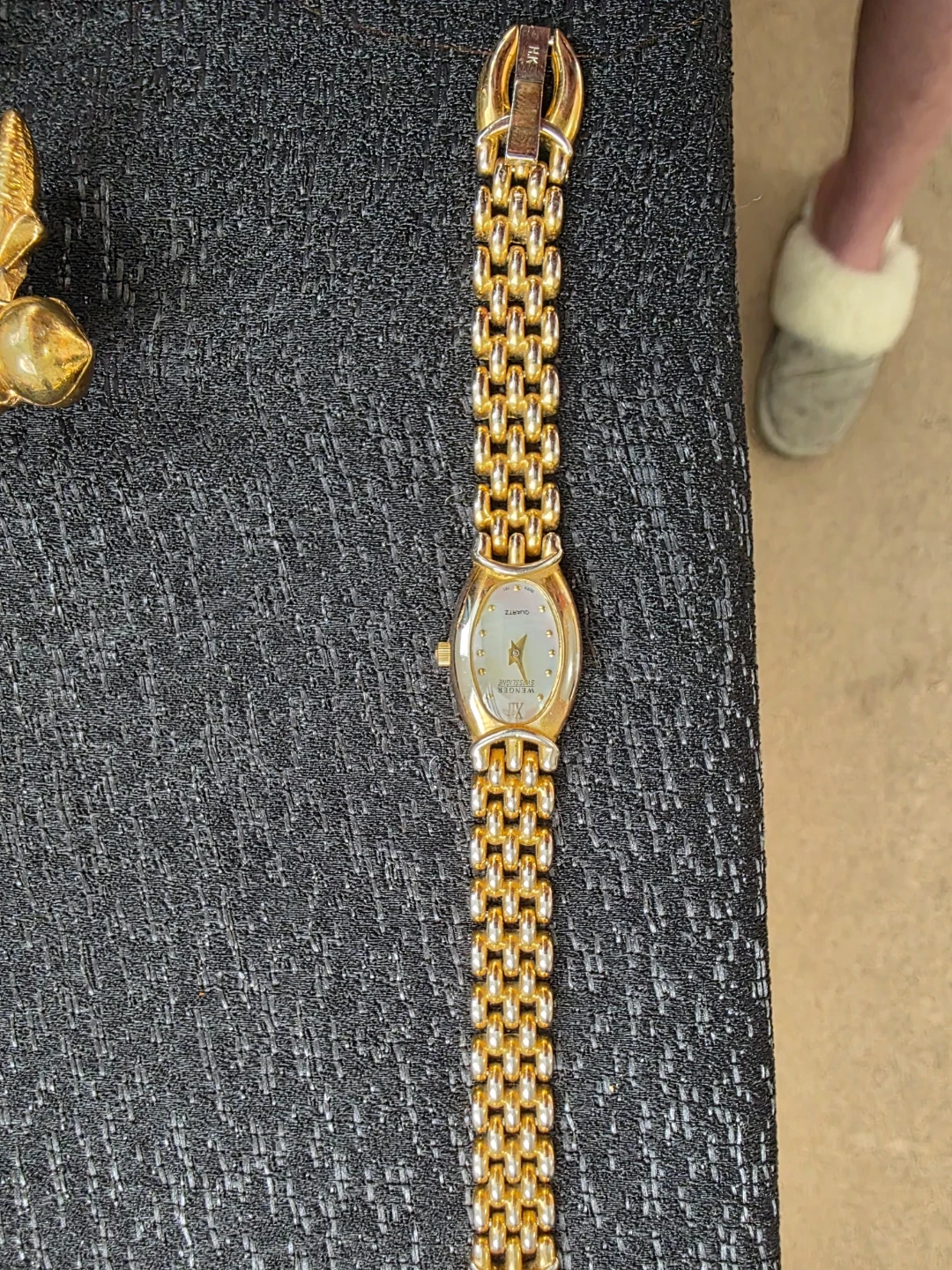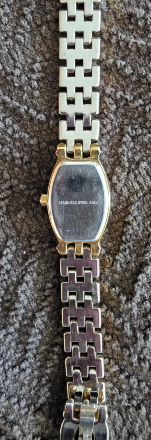 A Wenger Swiss Military ladies' quartz watch. It features a gold-tone and silver-tone link bracelet with a mother-of-pearl dial. The back is stainless steel.