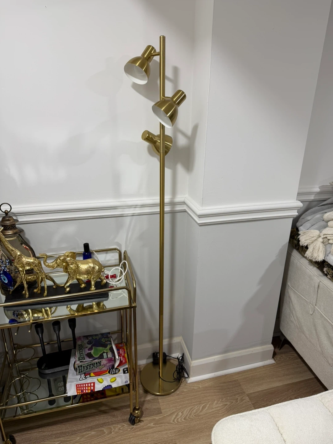 This is a gold-coloured floor lamp with three adjustable heads. It's made of metal and provides ample lighting for any room. The lamp stands tall and is a great accent piece.