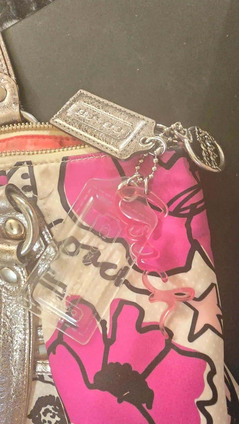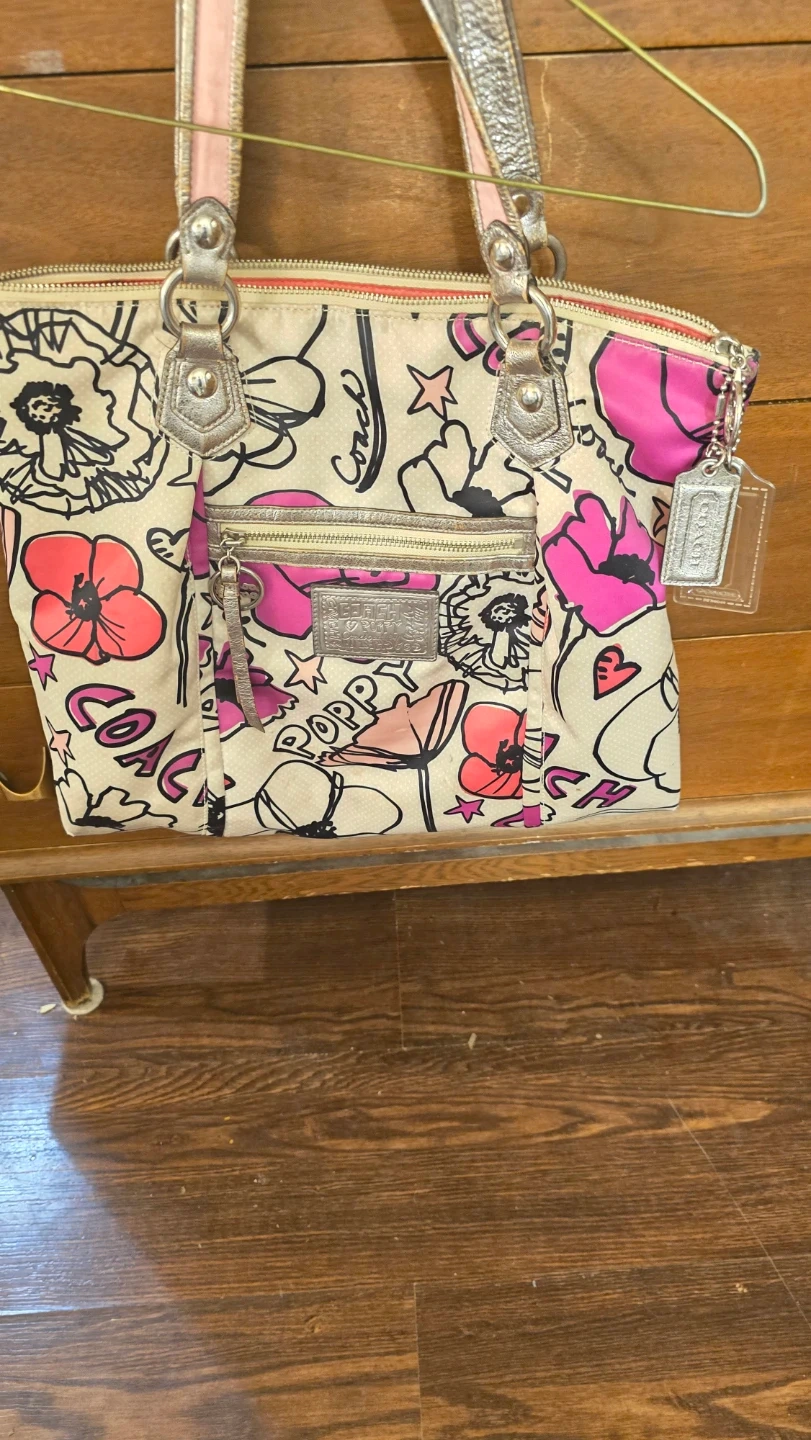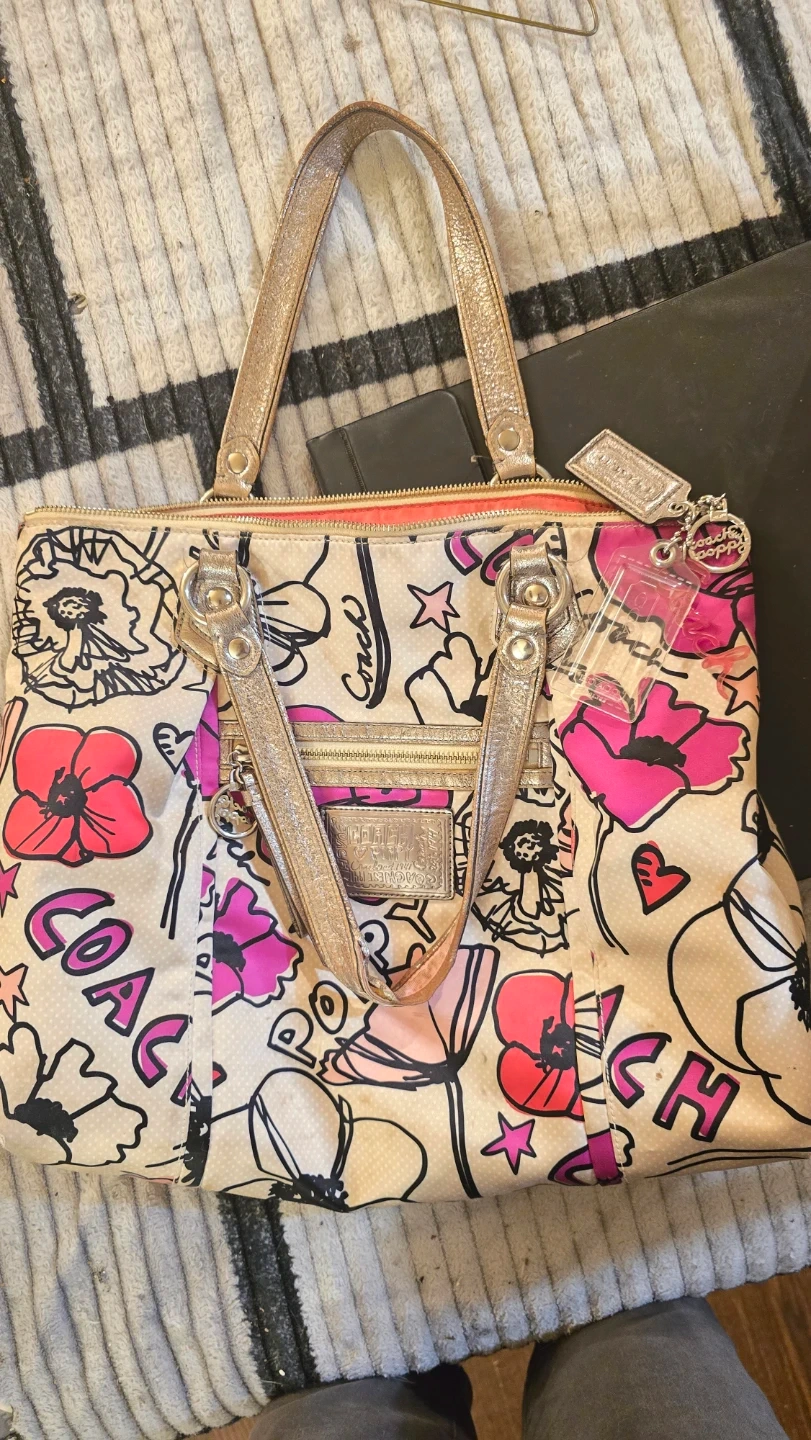 Selling a fun authentic Coach Poppy tote bag! It features a graffiti-inspired print with flowers and the Coach logo. The bag has silver hardware and pink accents, making it a stylish and eye-catching accessory. The interior is a bright coral colour. Perfect for adding a pop of colour to your outfit! The Coach Poppy Graffiti Print Tote Bag is made of canvas material. Also included leather trim and a satin interior. Retail price over $500 brand new. It's a collectible because it's discontinued. You will not find it anywhere. So don't be afraid to get your hands on this Gorgeous coach bag.