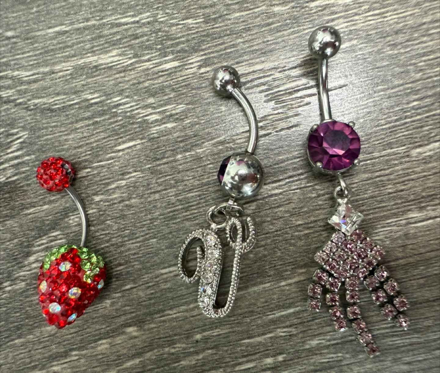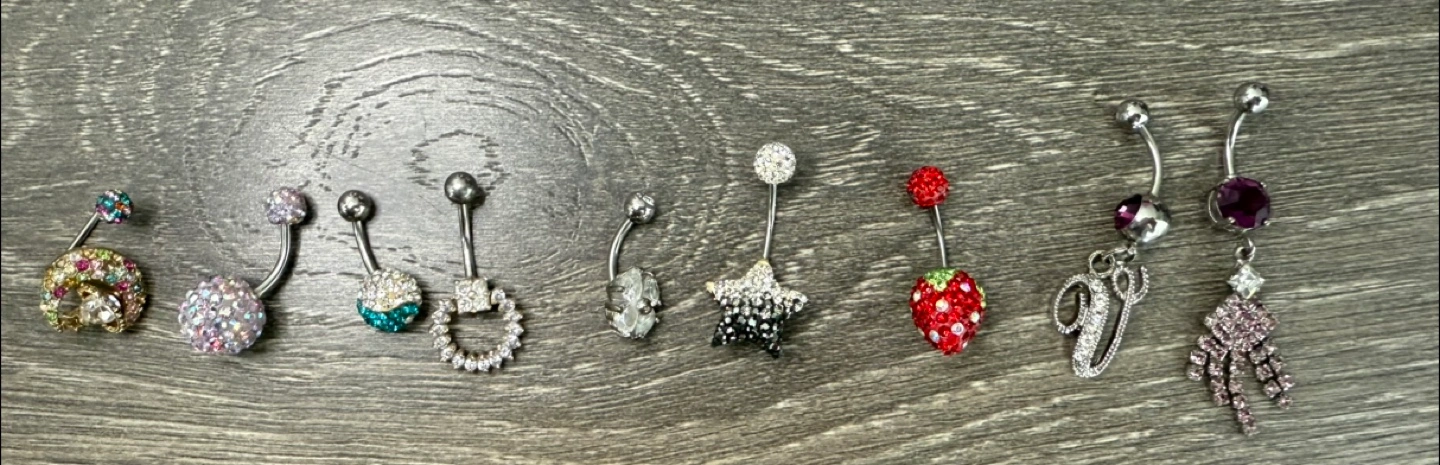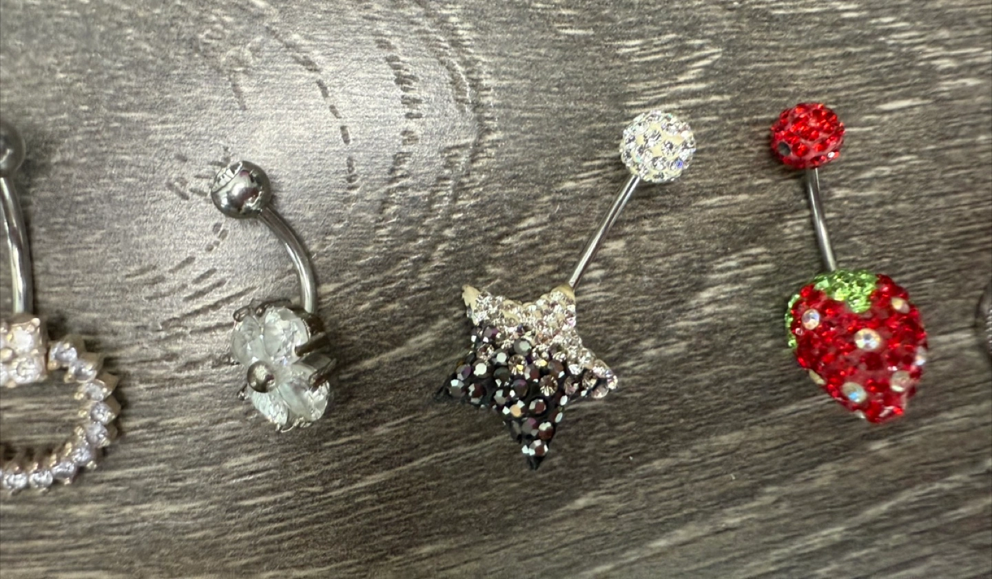 Selling a collection of assorted belly button rings! They come in various designs, including jeweled, strawberry, star, and letter charms. Add a bit of sparkle to your style with these fun accessories