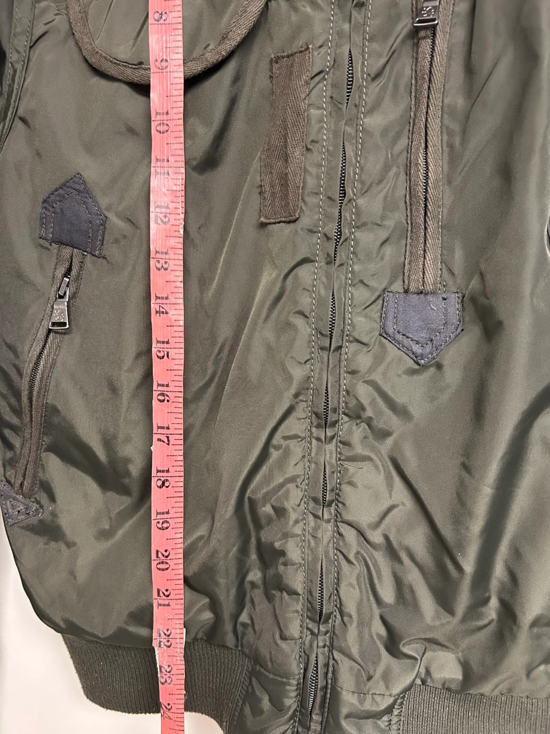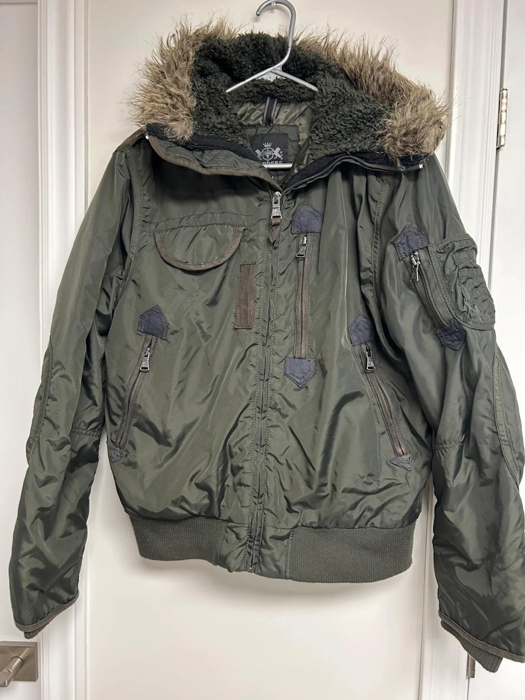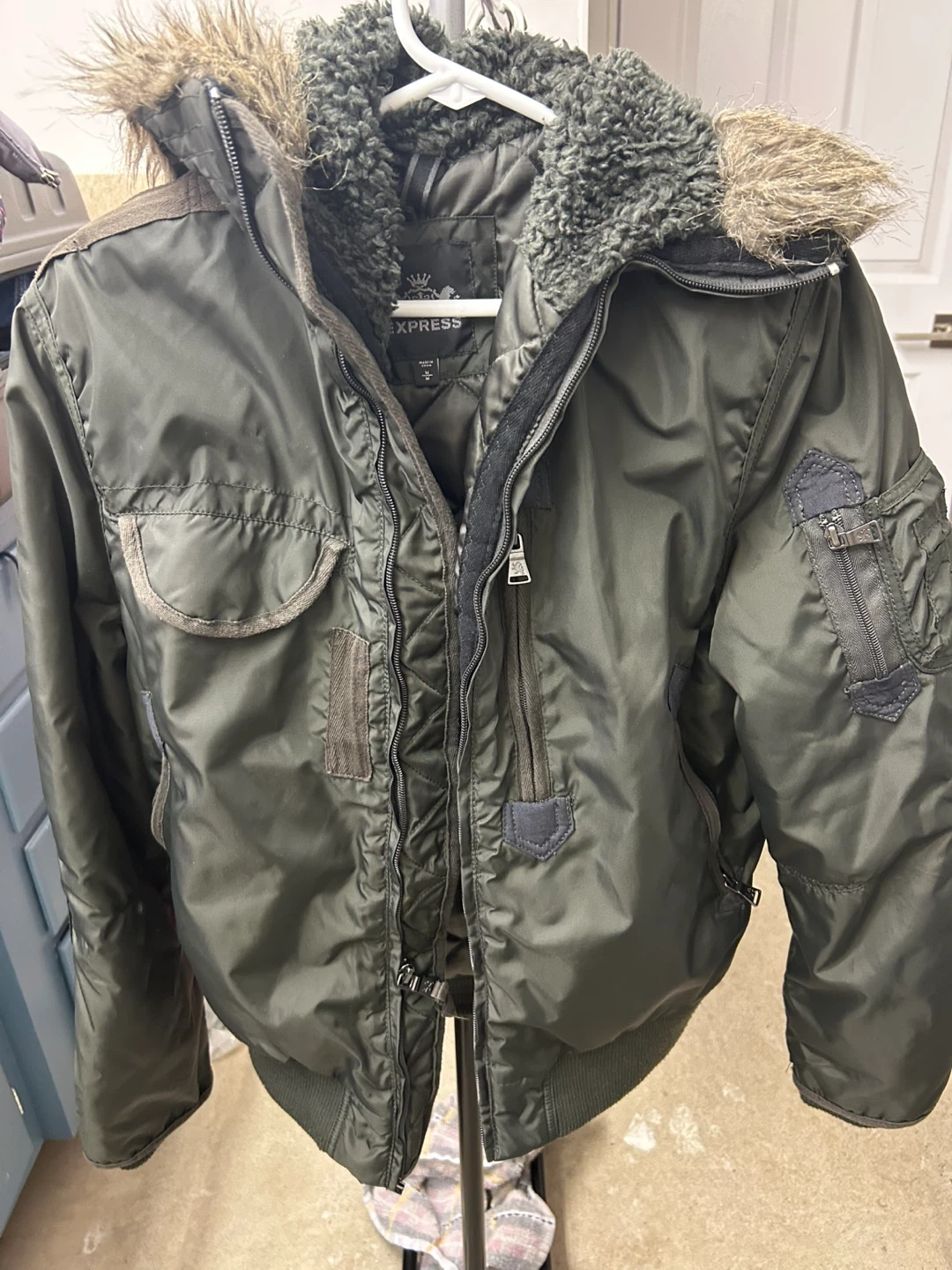 Olive green winter bomber jacket from EXPRESS. It's a size medium with a faux fur-lined hood. This jacket has multiple zippered pockets and a full zip closure.