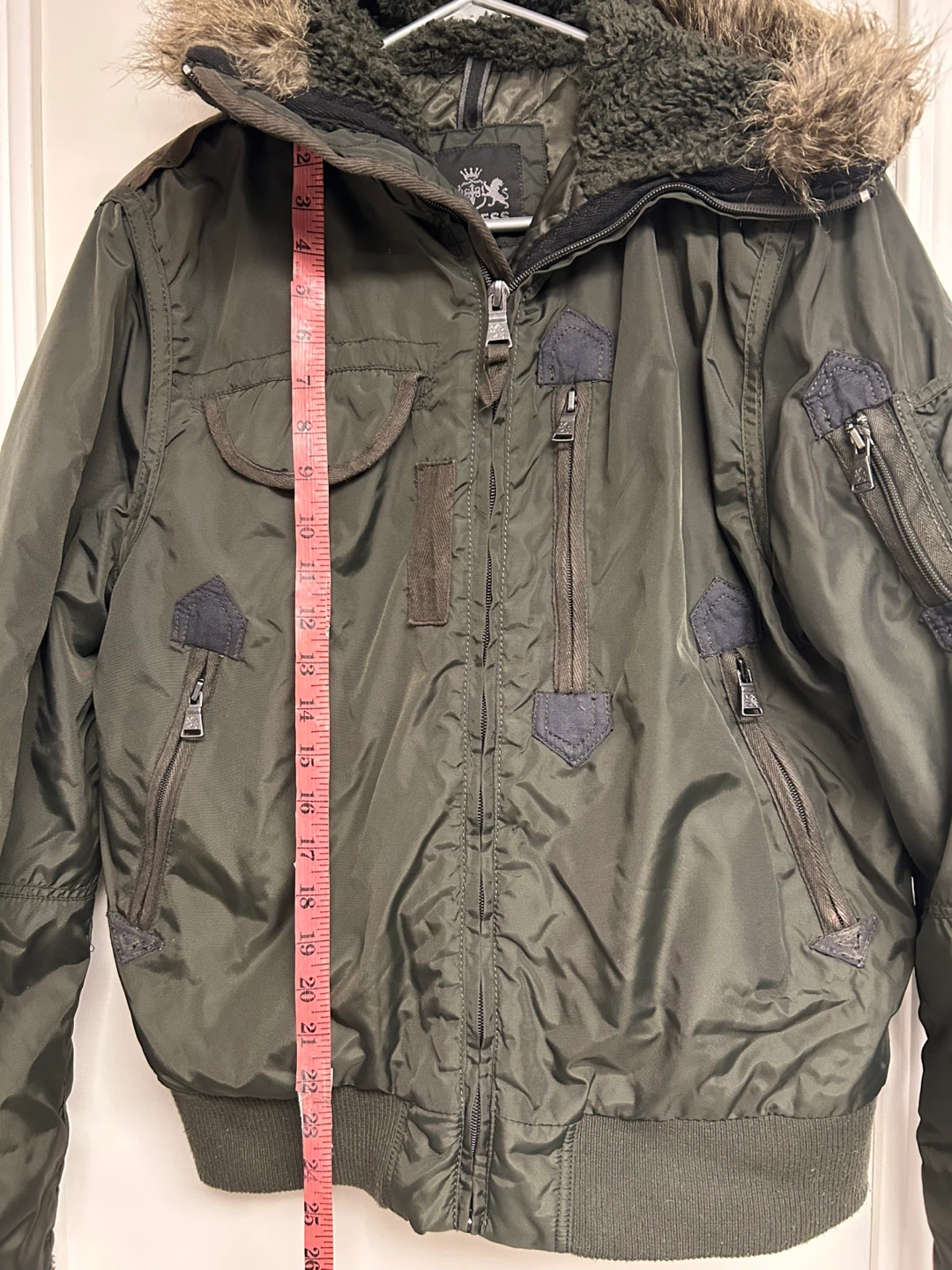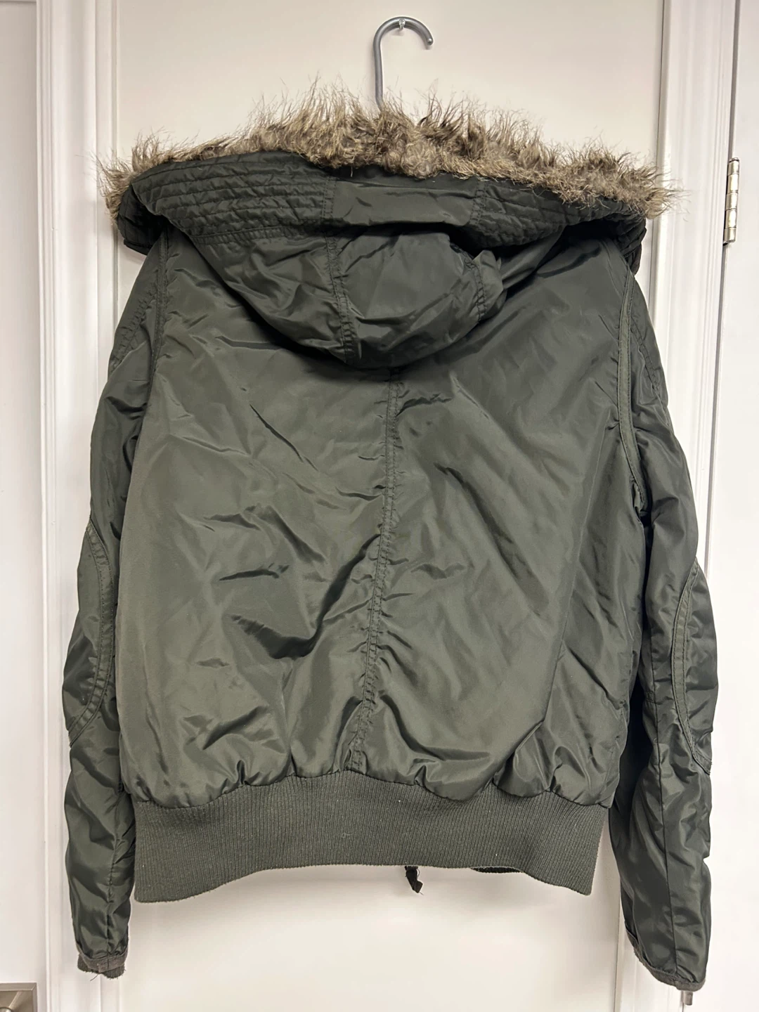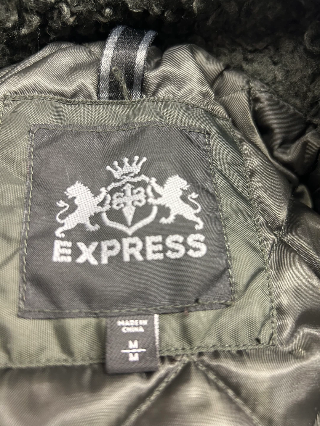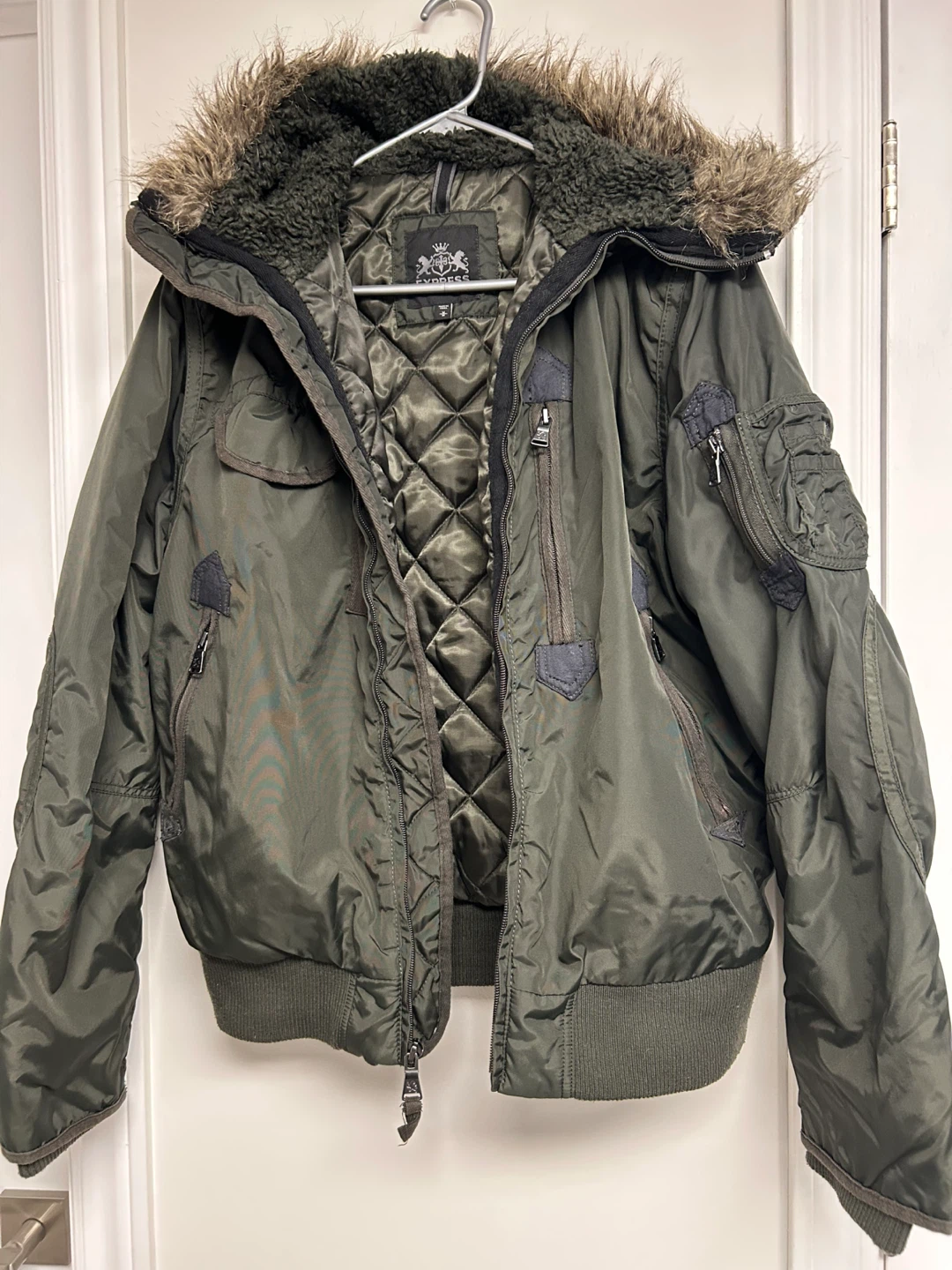 Olive green winter bomber jacket from EXPRESS. It's a size medium with a faux fur-lined hood. This jacket has multiple zippered pockets and a full zip closure.