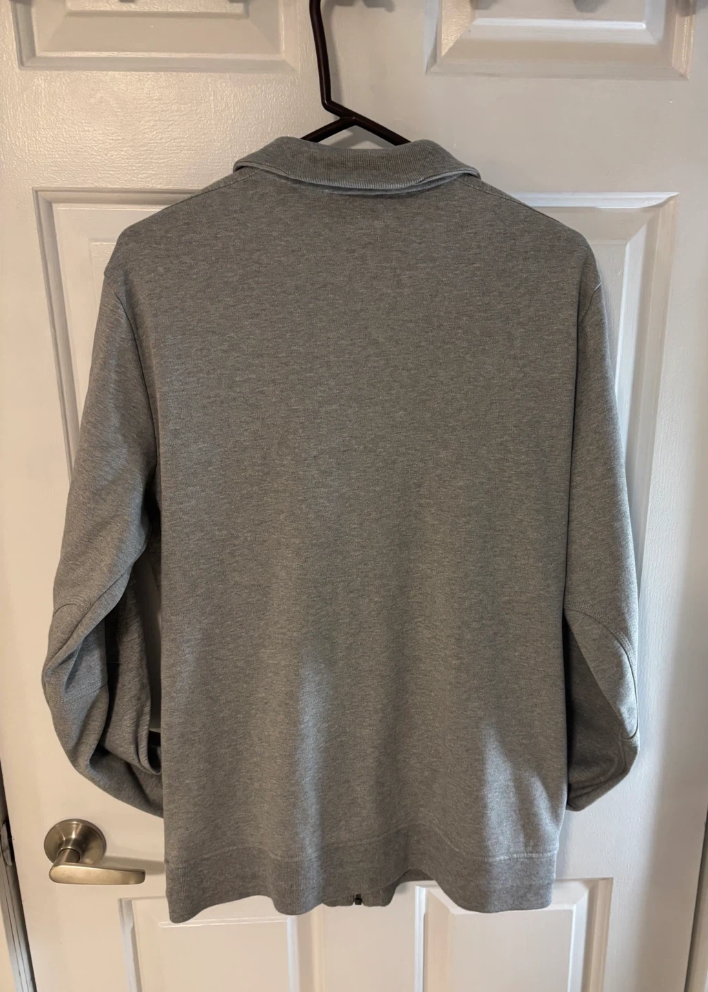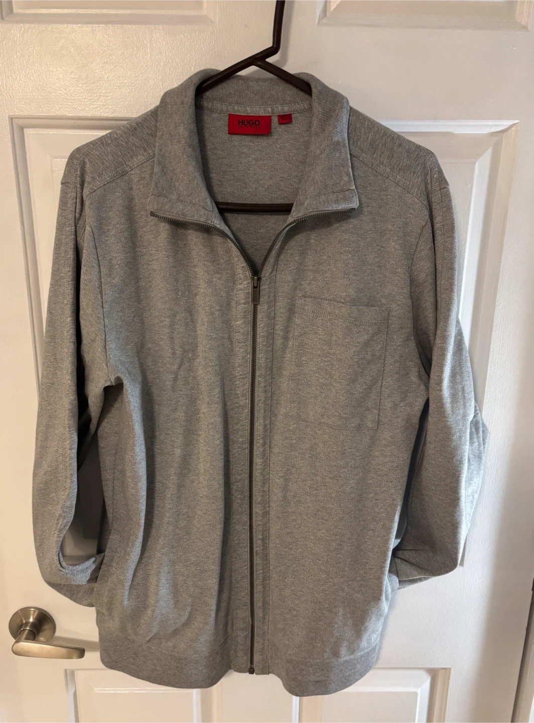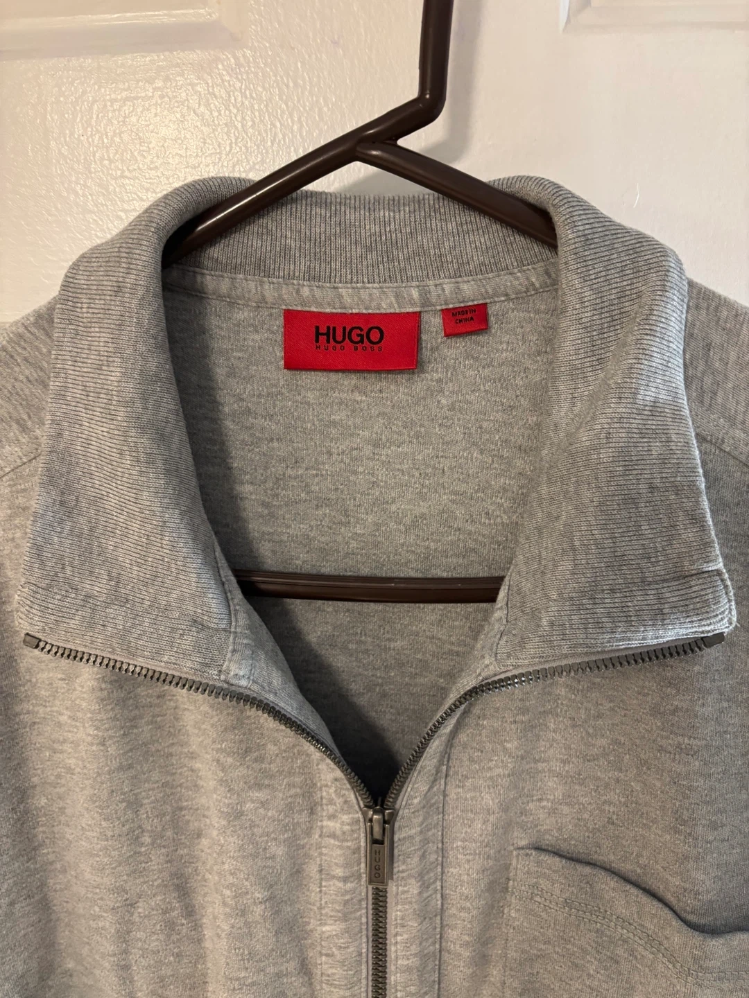 Selling a Hugo Boss zip-up jacket in grey colour. It's in great condition and is a size XL. Perfect for layering or wearing on its own!