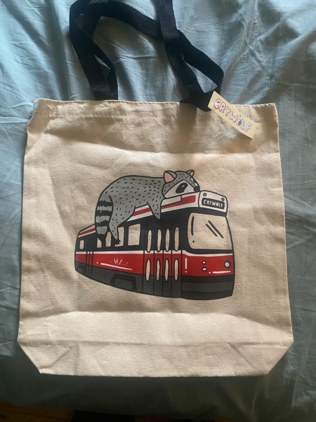 Crywolf Tote Bag with Raccoon and Streetcar Graphic