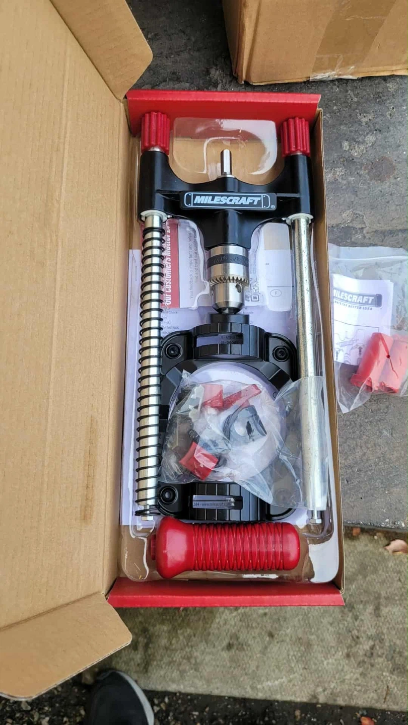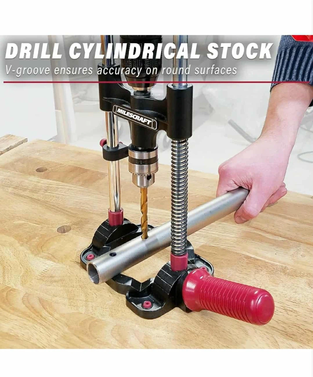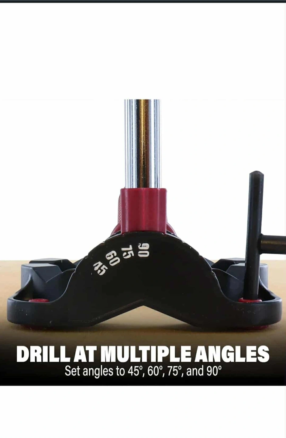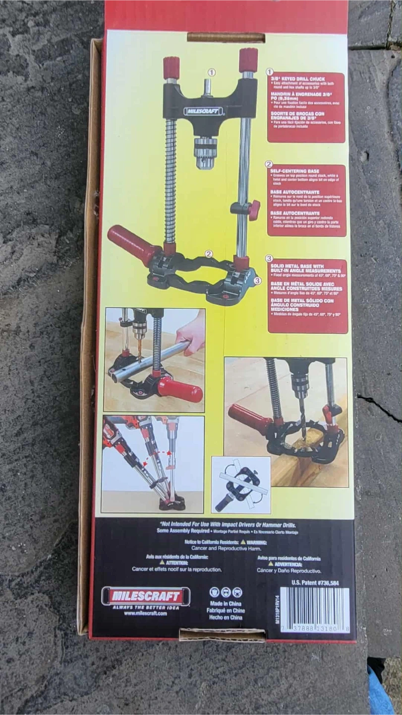 Check out this Milescraft DrillMate portable drill press! It's great for drilling straight, accurate holes and can be used almost anywhere. The V-groove ensures accuracy on round surfaces, and it can drill at multiple angles (45°, 60°, 75°, and 90°). Sturdy metal design fits bits up to 3-1/2" in diameter. Save time on your projects with this versatile drill guide