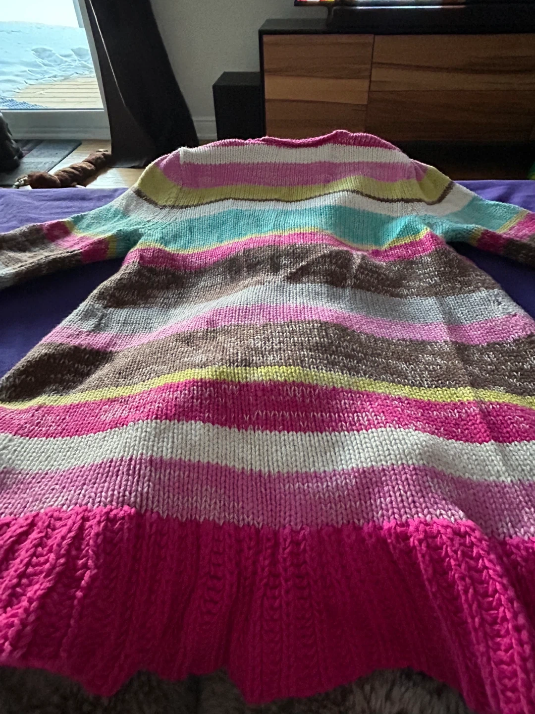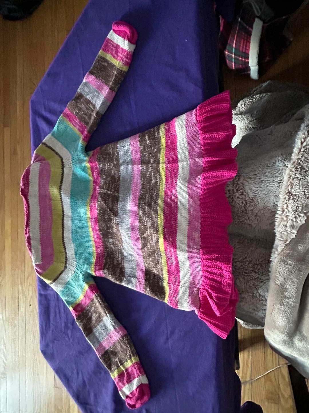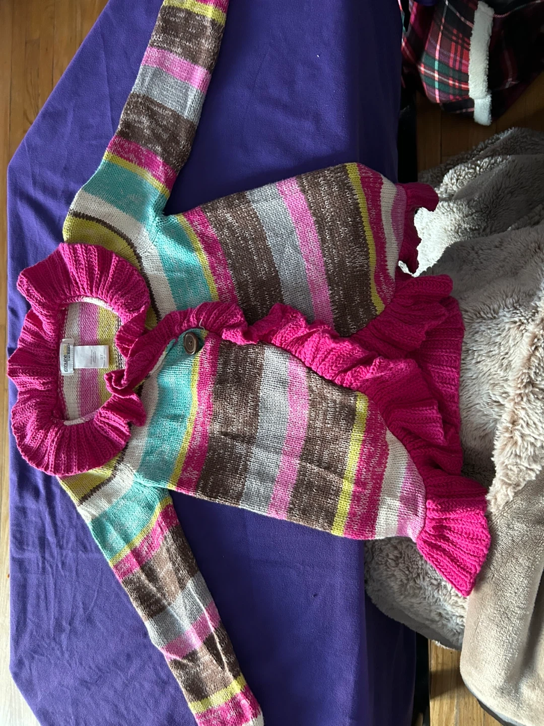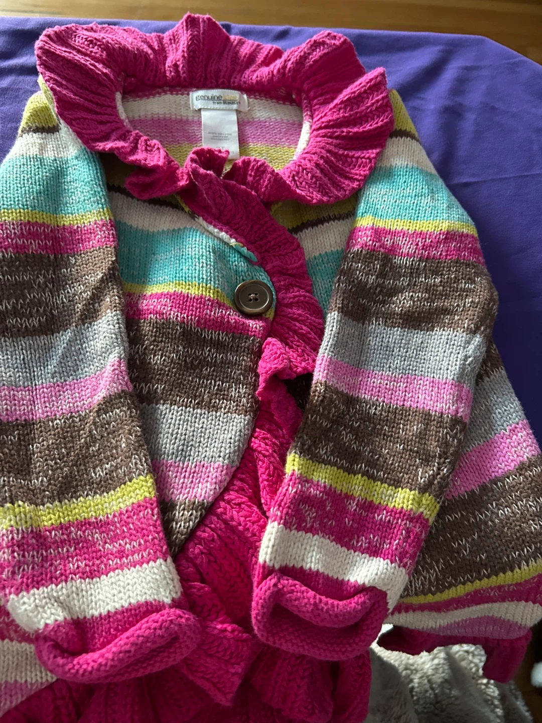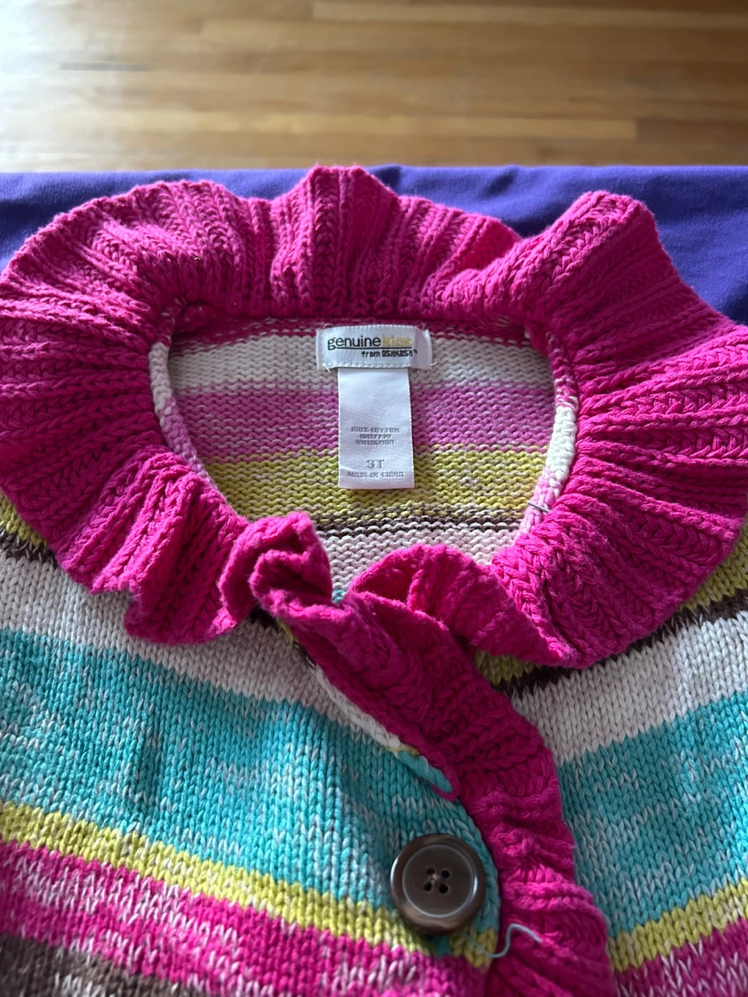 This is a Genuine Kids from OshKosh sweater for a toddler. It's a size 3T and made of 100% cotton. Features a colourful stripe pattern with ruffled trim and a button closure.