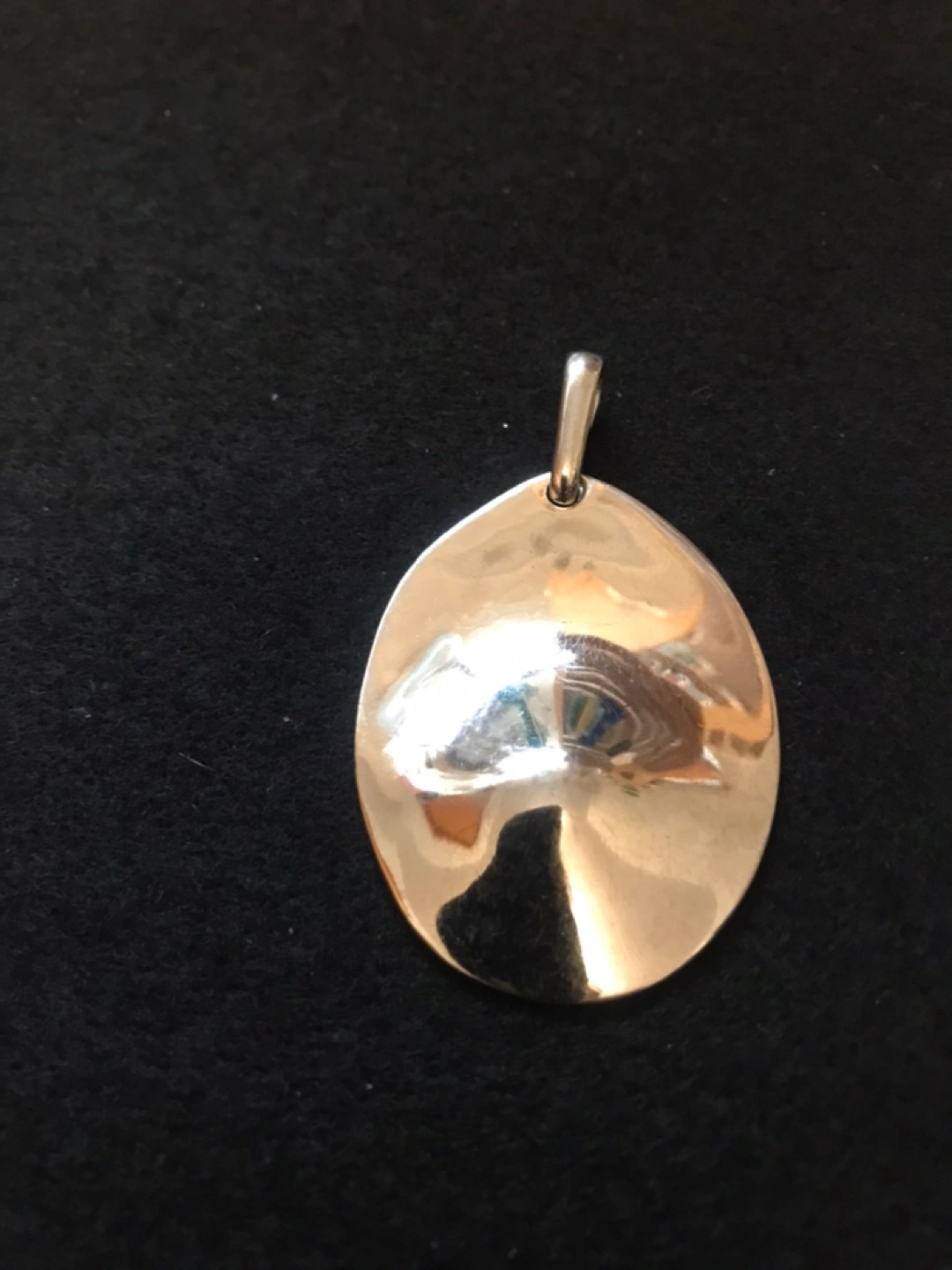A shiny silver oval pendant with a hammered textured back. It's a simple, classic piece for any outfit. Measures 2” X 1.5”