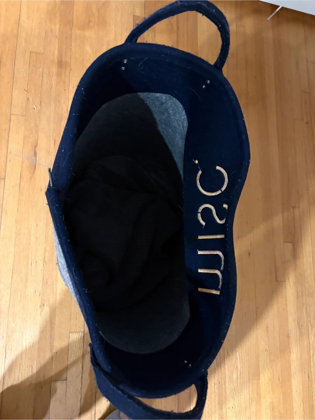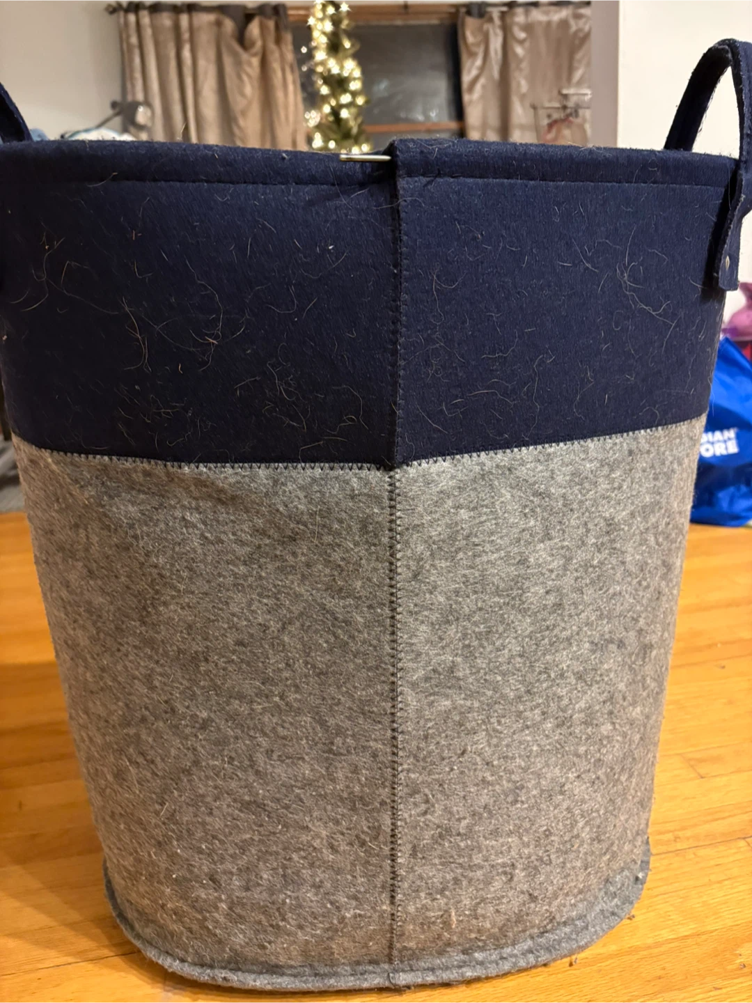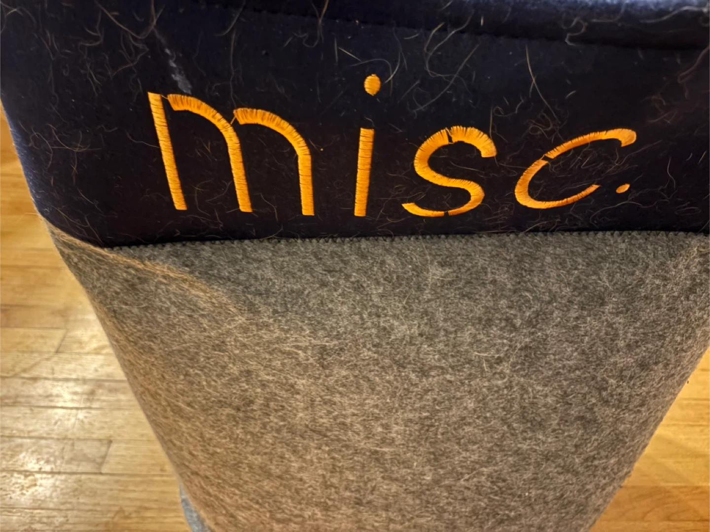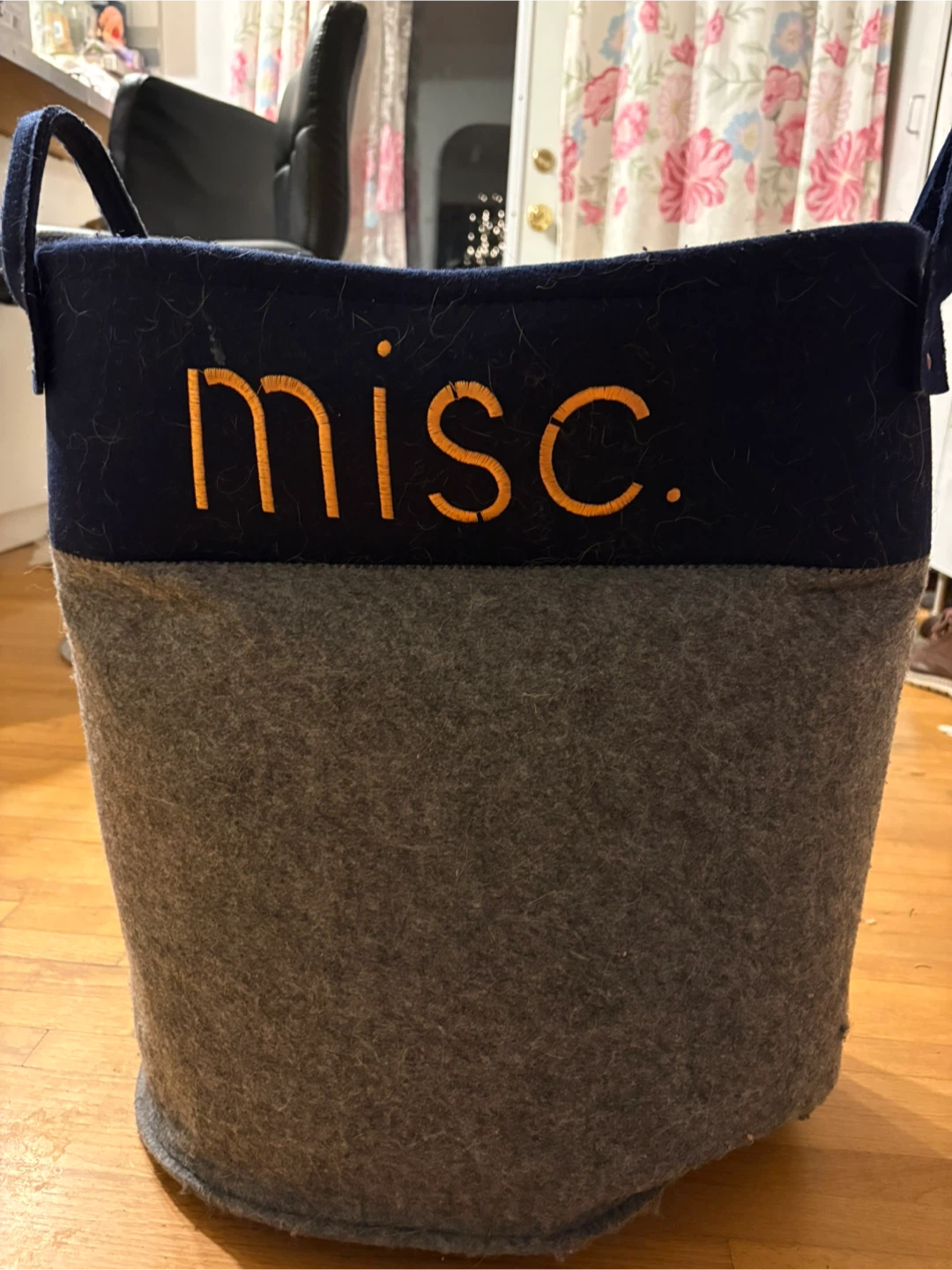 Here's a cute felt storage basket! It's in great shape and ready to help you organize your space. The basket features a two-tone design with a navy blue top and a grey felt bottom. The word 'misc.' is embroidered in orange on the navy section. Perfect for any room! Size is about 12*18*20 inches. Pick up at Morley trail NW