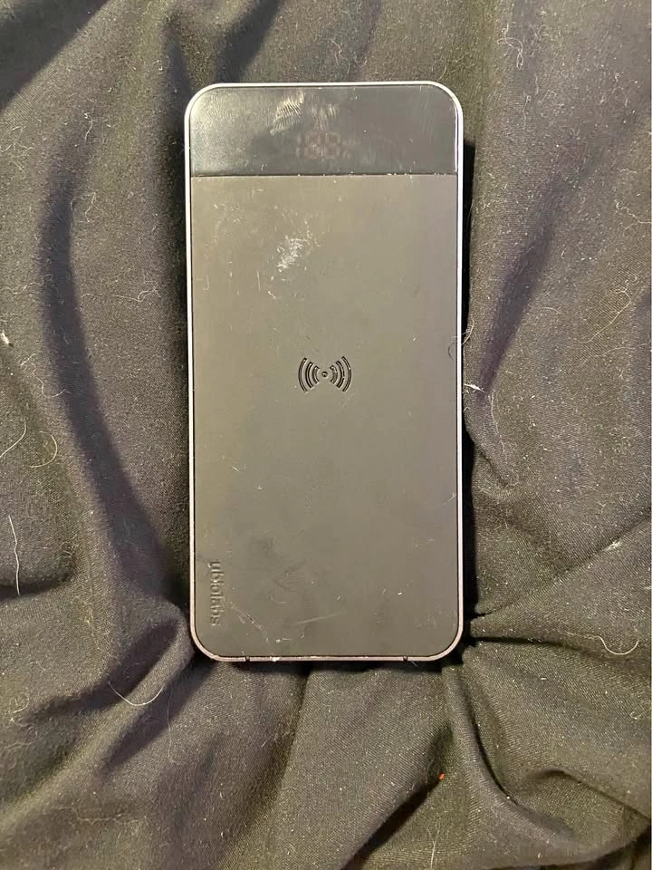 Black ubiolabs portable battery with wireless charging pad. This power bank has one USB-A port, one USB-C port, and one Lightning input port. It is slim with a grey metal frame and a digital percentage display at the top.