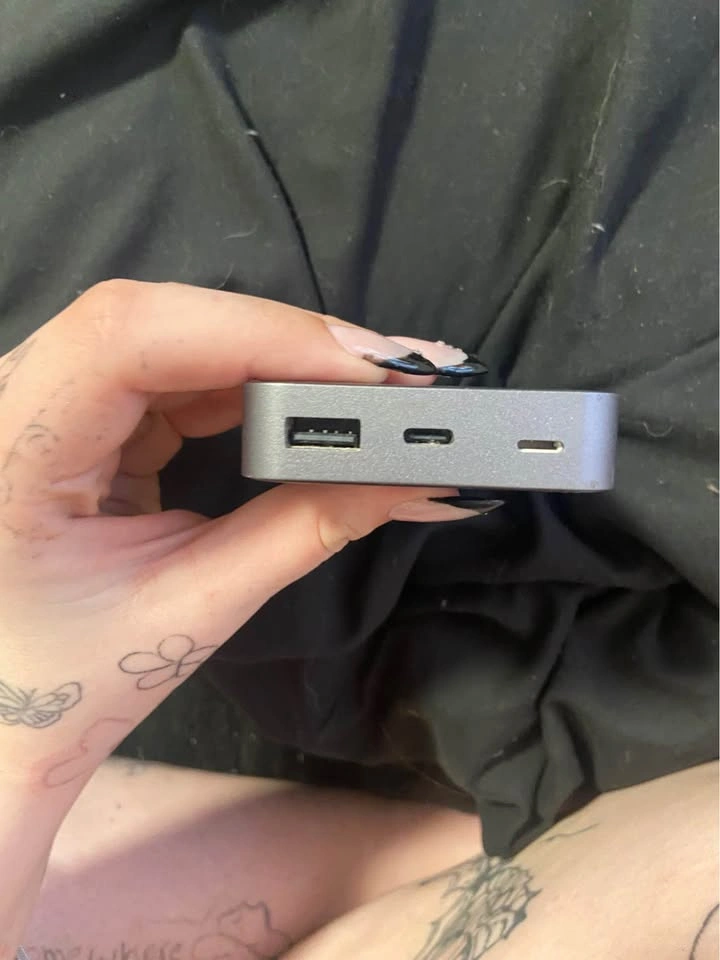 Black ubiolabs portable battery with wireless charging pad. This power bank has one USB-A port, one USB-C port, and one Lightning input port. It is slim with a grey metal frame and a digital percentage display at the top.