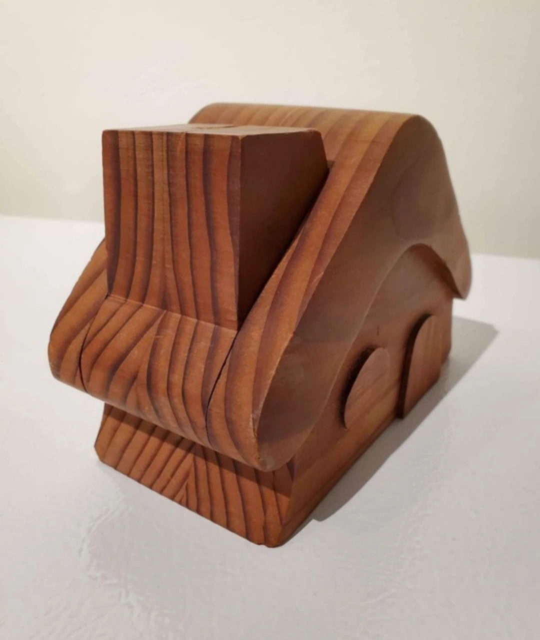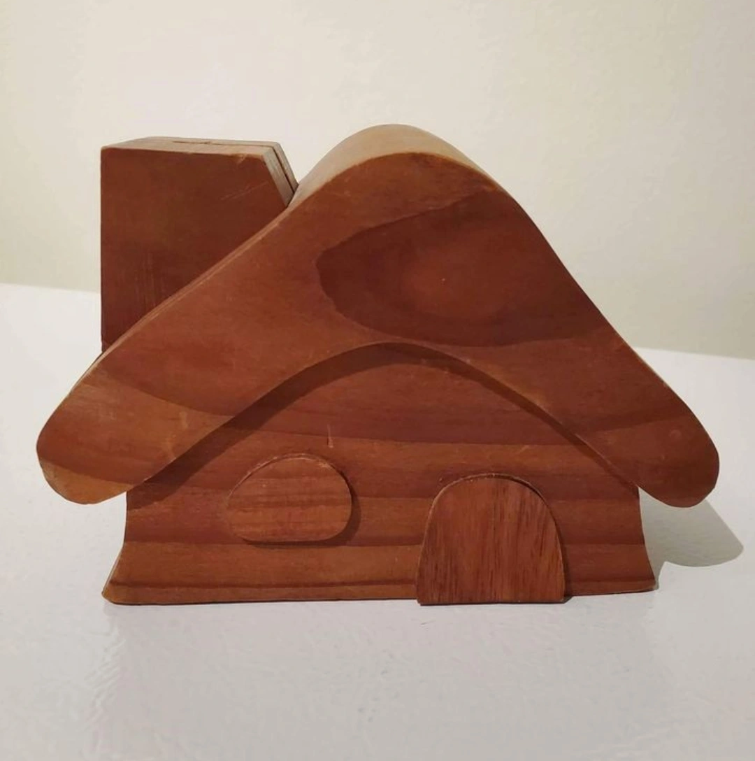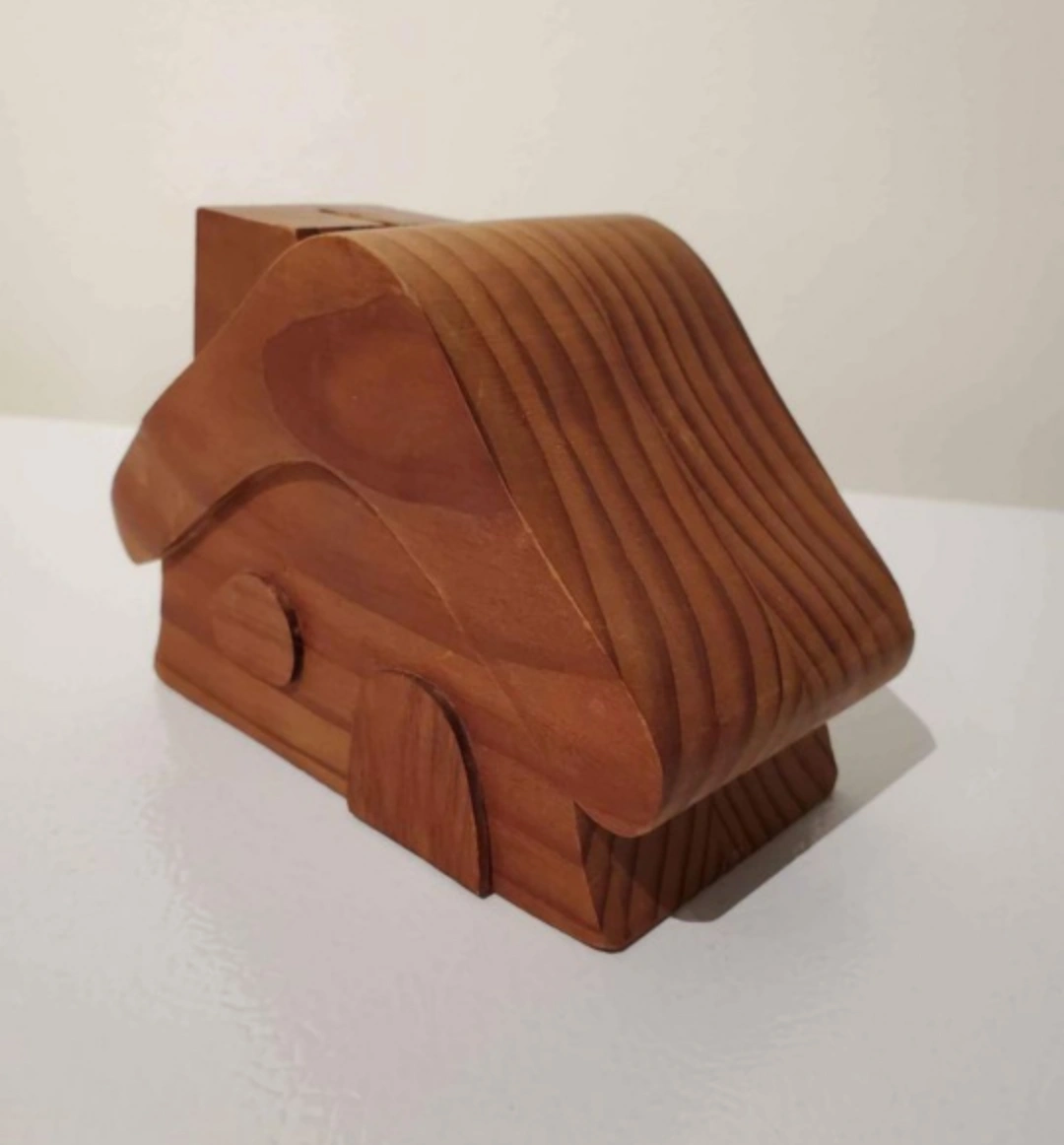 Rare find! Vintage from the 1970's. Adorable rustic solid wood coin bank with flip-out chimney. This woodcraft was made in Canada by Elf Craft. It measures 5 3/4 L x 3" W x 4" H.