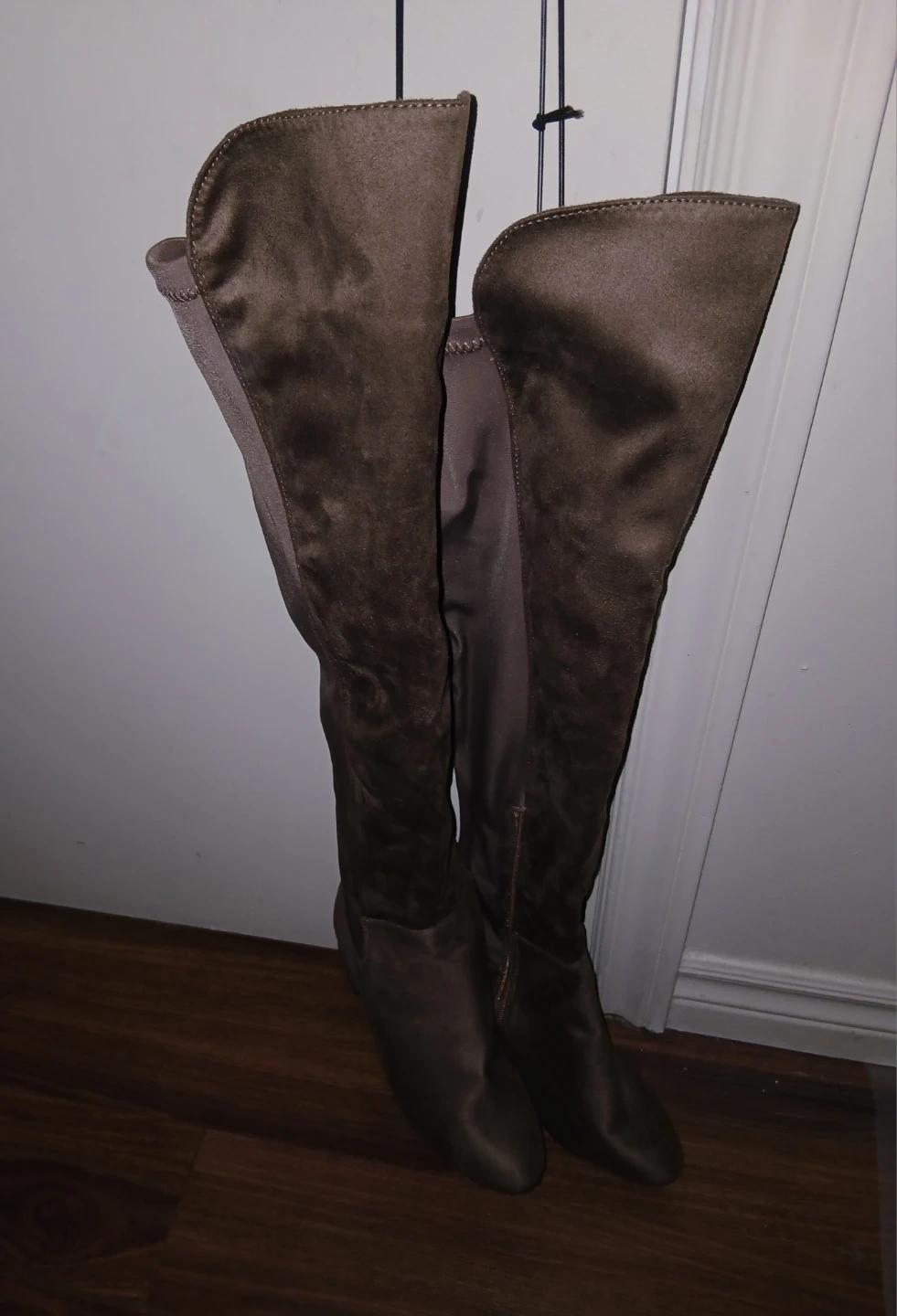 Brown over-the-knee boots with a zipper closure & stretch fabric detailing. Heel height is approximately 3 inches. *NWT