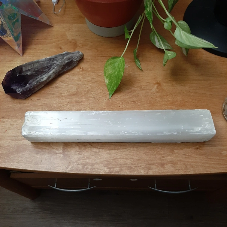 “Transform your space with this striking, polished selenite slab—a powerful, natural energy amplifier known for its cleansing properties. Its satin-like glow captures the light beautifully, making it a captivating centerpiece. Perfect for crystal enthusiasts, meditation spaces, or as an elegant decor piece, this slab not only uplifts the room but also radiates calming energy. Ideal for charging other crystals or simply bringing serene vibes to any setting. Limited availability—bring home a piece of pure, radiant energy today!”
