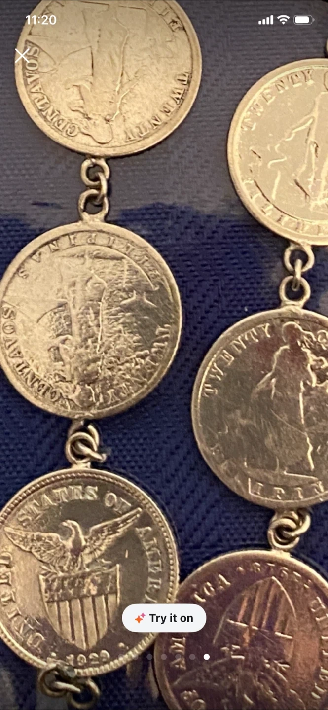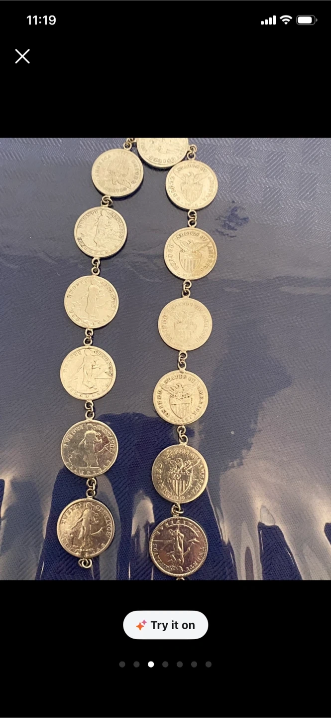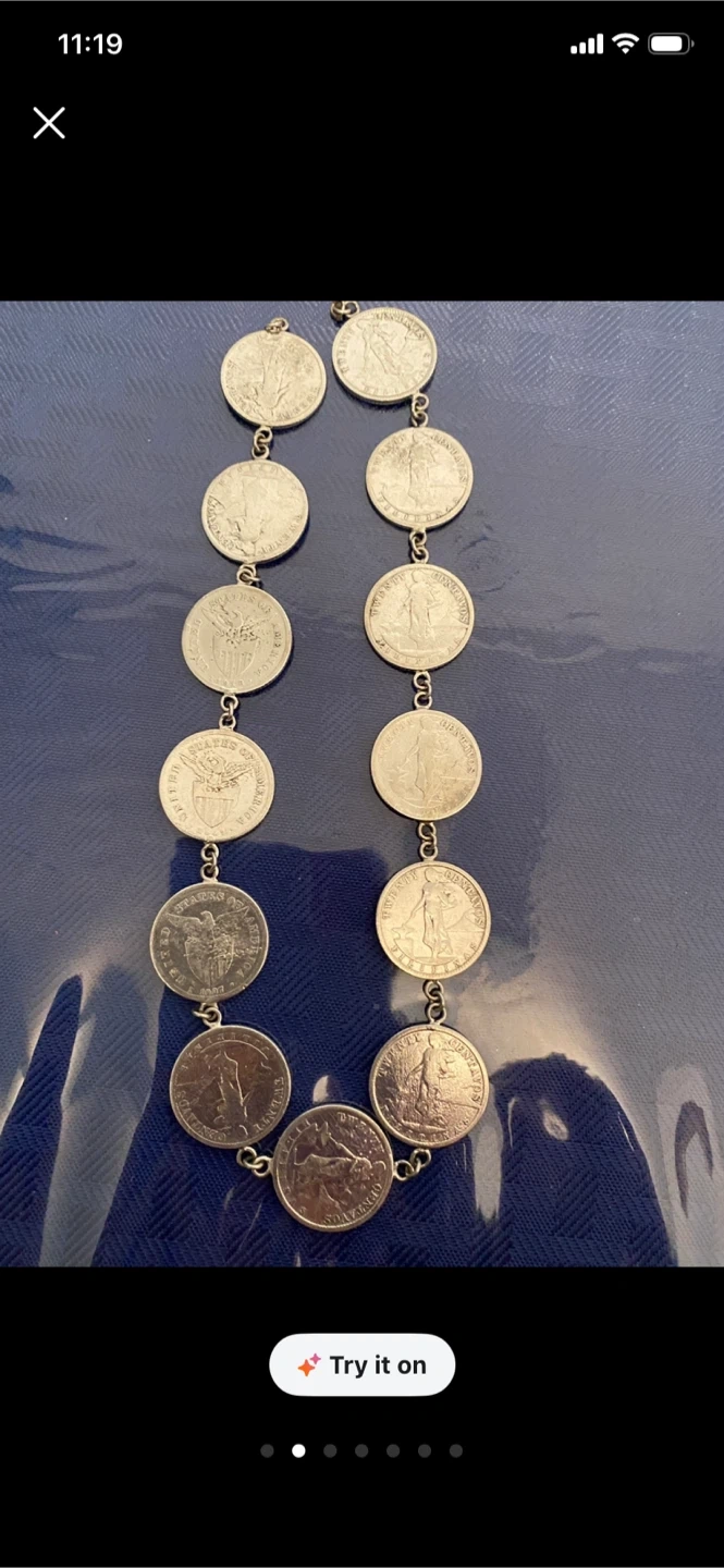 A unique necklace made from various silver coins, linked together. It's a statement piece for any collector or fashion-forward individual. The coins appear to be vintage US currency, showcasing different designs.1917-920,s