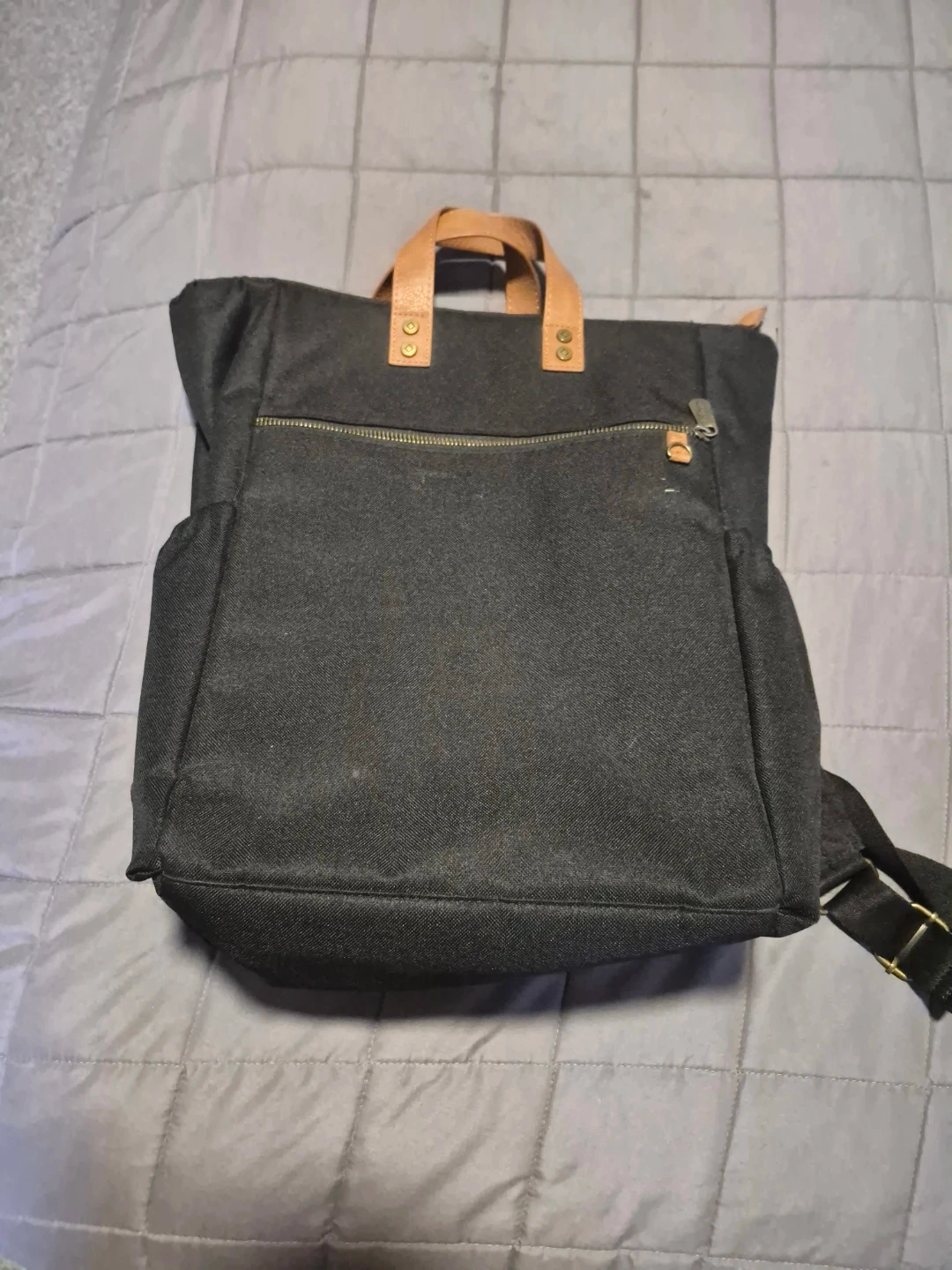 Tgirty-one Black canvas backpack with tan leather handles and strap details. It has a zippered main compartment and a front zippered pocket. The interior is lined and includes a smaller zippered pocket. This bag's versatile design makes it suitable for everyday use.