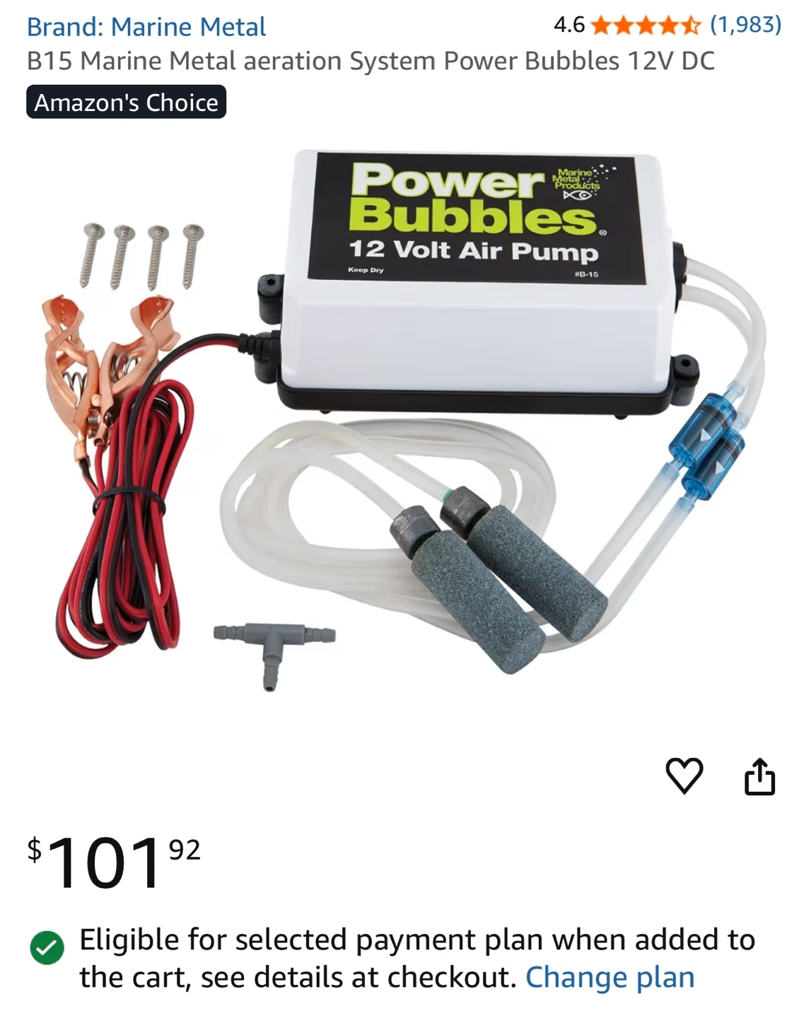 This is a Marine Metal B15 12 Volt DC air pump. It comes with two airline tubes with aerators and a T-splitter. Also includes battery clips and mounting screws.