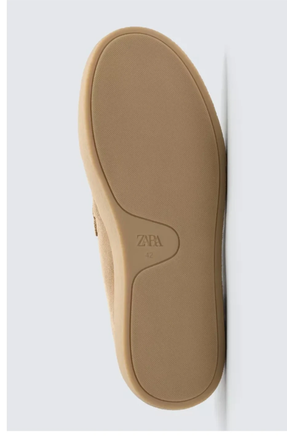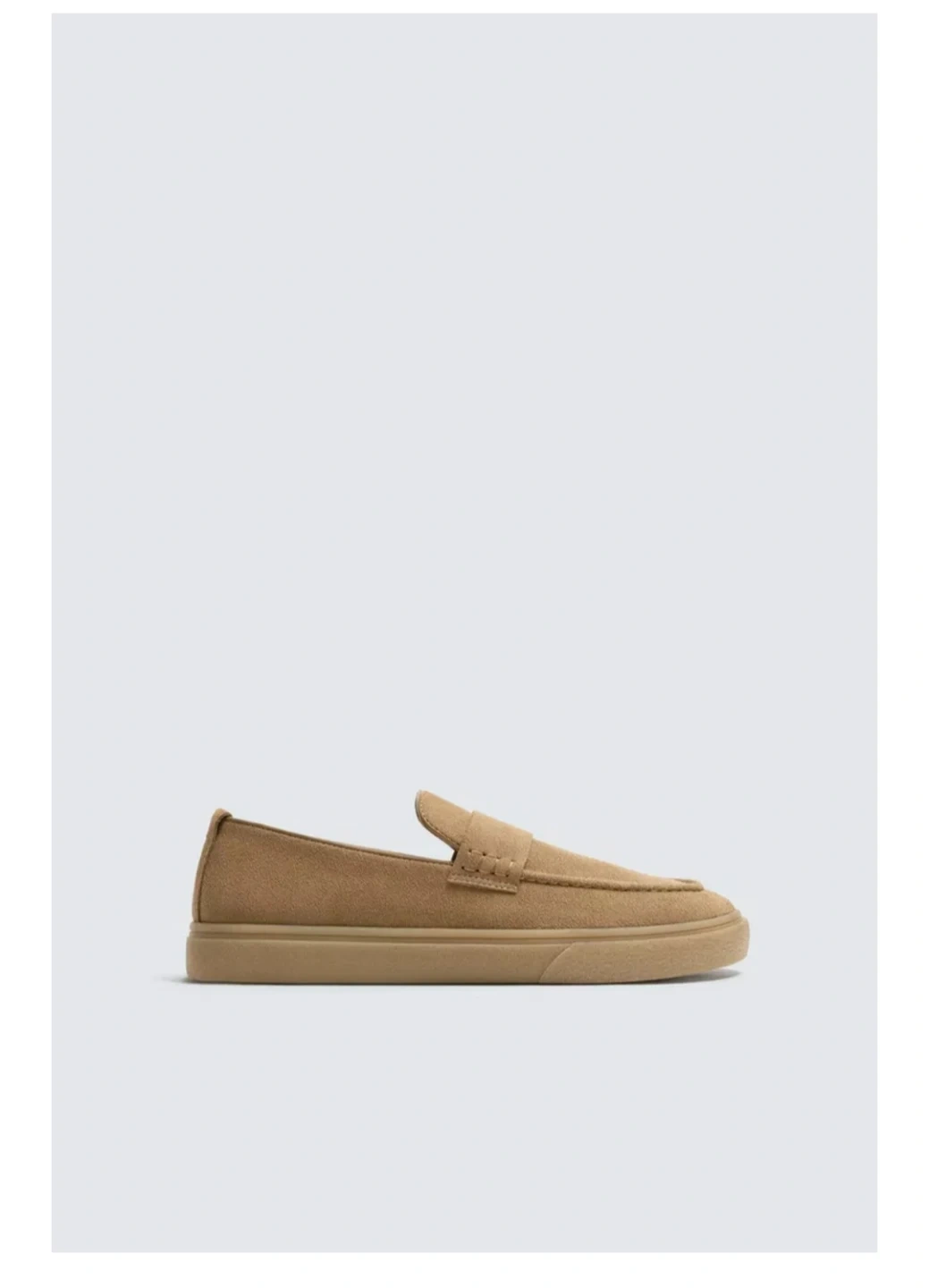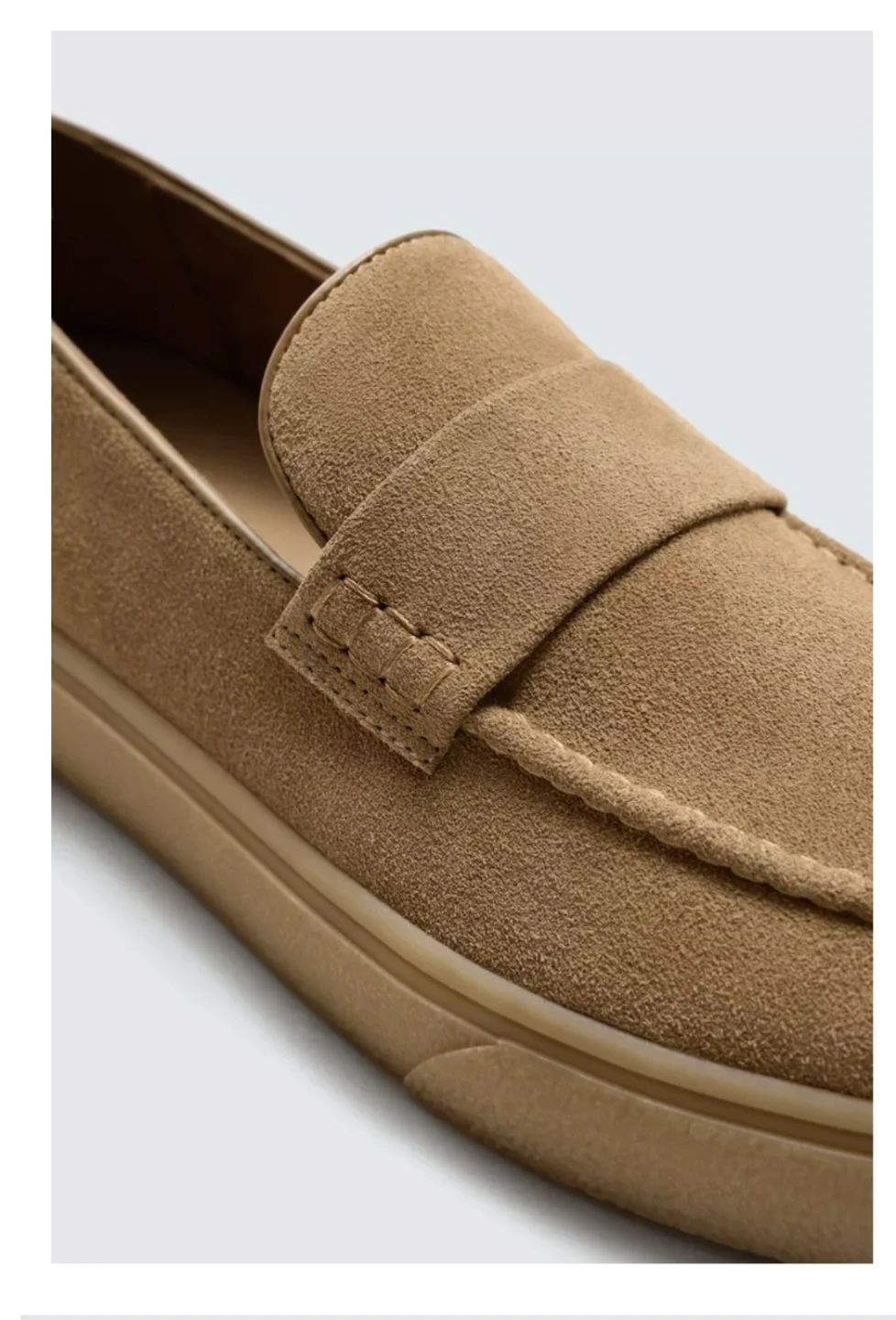 Casual loafers in sandy brown. Leather upper with a split leather finish and saddle detail on the instep. Round toe with a matching sole. These are a size 40