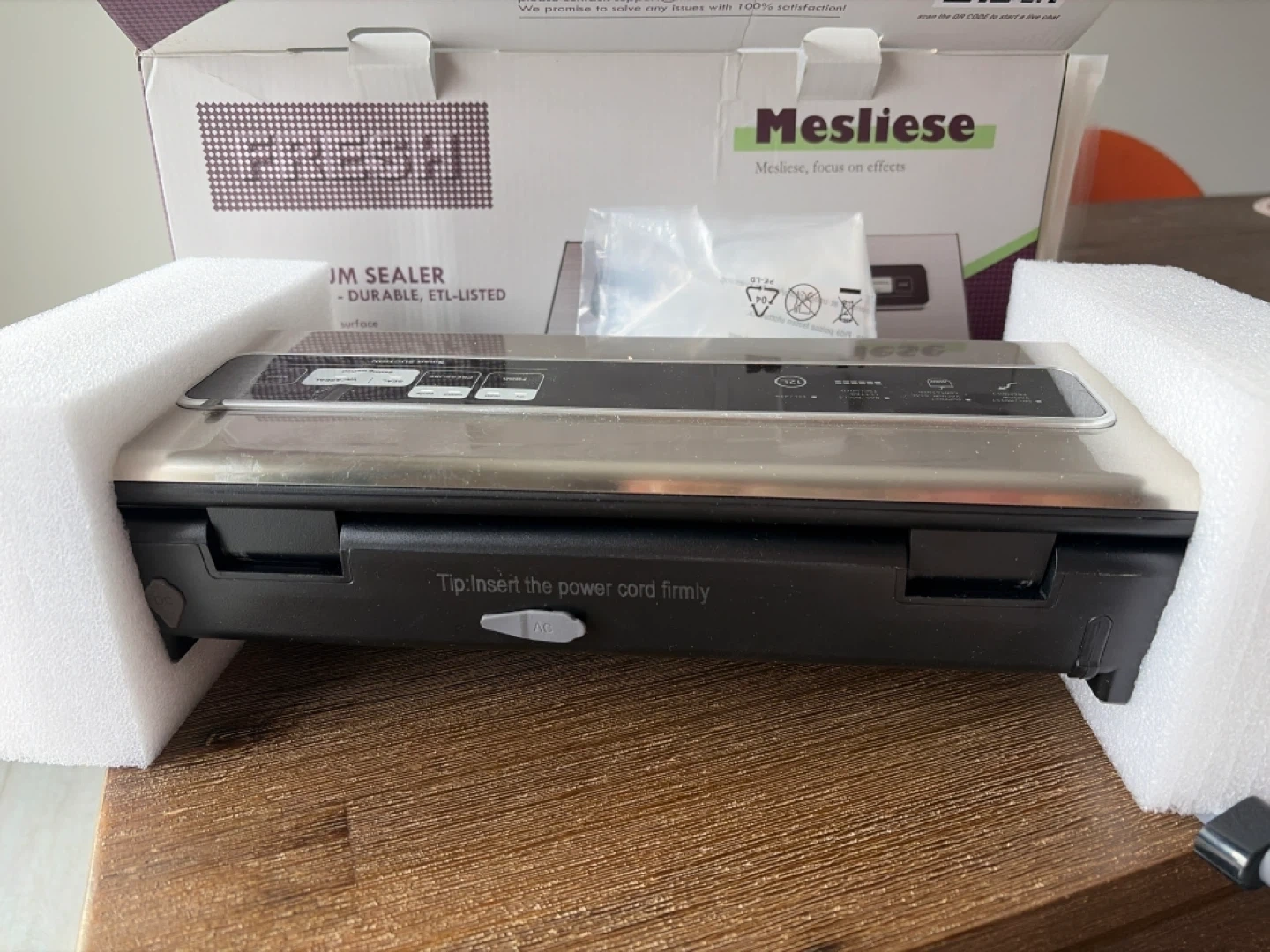This Mesliese vacuum sealer machine is durable and ETL-listed. It features a stainless steel surface, ergonomic design, and multi-functions. Includes 1x stainless steel vacuum sealer, 1x roll of vacuum sealer bags, 2x vacuum sealer bags, and 1x power cord.