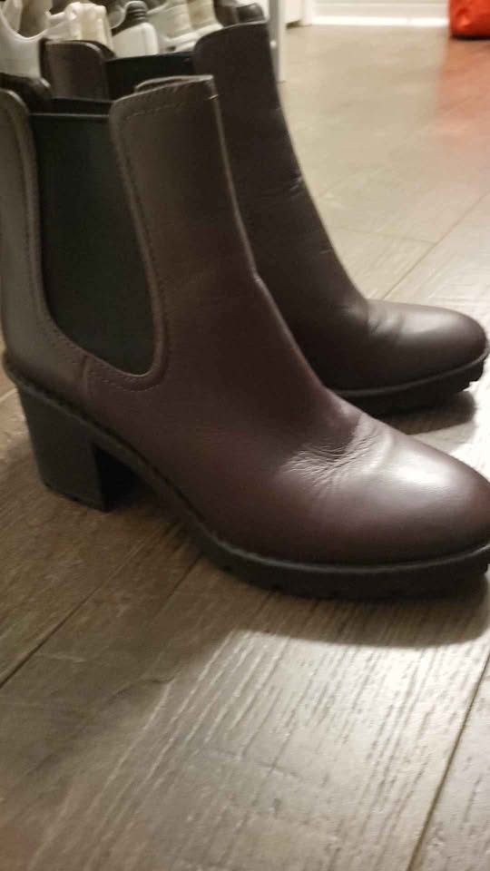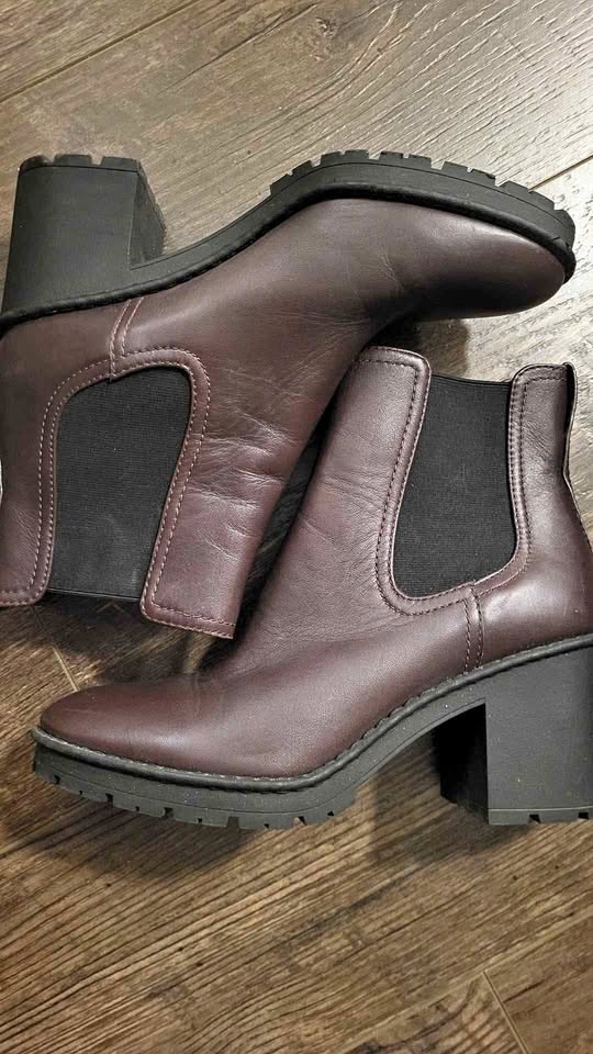 Slightly used, stylish, comfy heeled leather boots, lug chelsea, nice heeled boots, brownish maroon in color